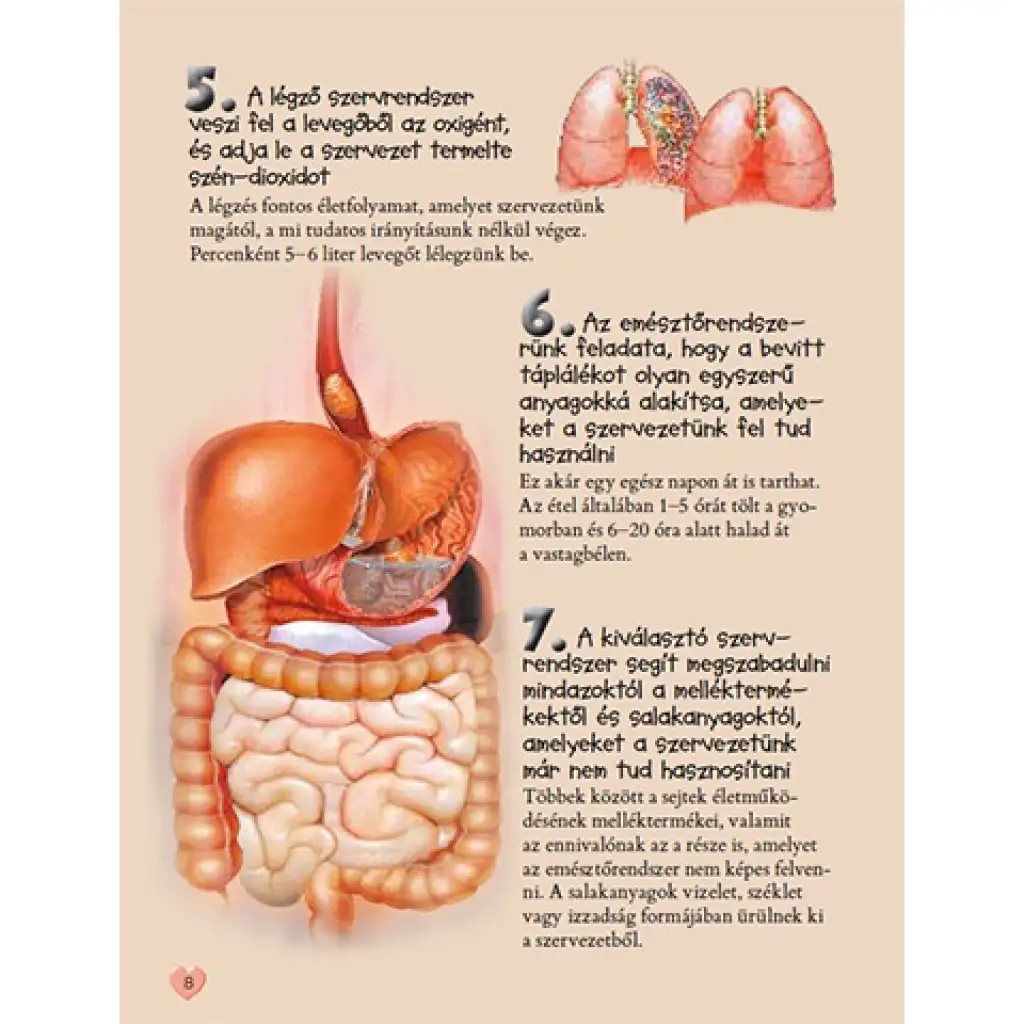 Iz te knjige se lahko otroci naučijo veliko zanimivih stvari, na primer, koliko mišic je v človeškem telesu. Spoznajo lahko, kako delujejo naši najpomembnejši organi, iz česa je sestavljen proces prebave ali razmnoževanja. Toda to je le nekaj primerov, saj lahko s pomočjo številnih barvitih ilustracij prehodite naše telo od podplatov do vrha glave. Oseminštiridesetstranska knjiga je zasnovana za otroke približno devetih let.