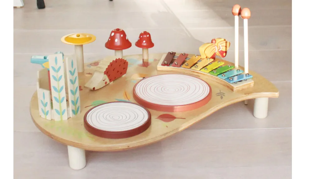 Ta lesena miza vsebuje barvit ksilofon, zvončke, lesene bobne, tolkala iz želoda, ptičje piščalke in leseni zvonec. Otroci lahko poleg tega še cvrčijo z metuljevimi krili in vlečejo tolkalo iz želoda po hrbtu ježa!