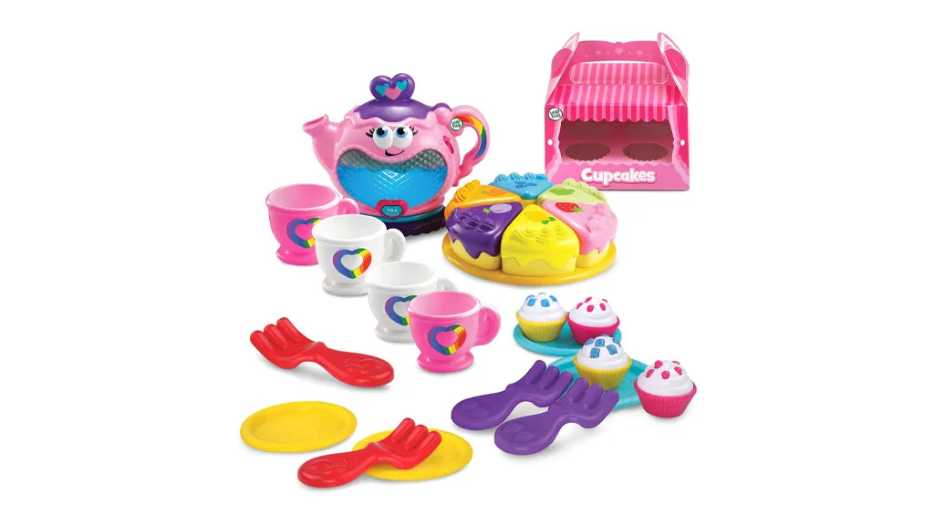 Organiziraj domišljijsko popoldne s čajem, polno glasbe! Ta 25-delni komplet vsebuje čajnik, štiri skodelice za čaj, vilice, krožnike, štiri cupcake-e, škatlo za cupcake-e, šest kosov plastične torte in stojalo za torto. Čajnik igra različne pesmi, ko se otroci igrajo.