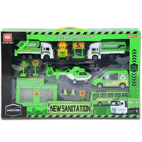Malčki lahko med igro za odvoz smeti uporabljajo vozilo z zabojnikom, vozilo cisterno in tudi avtobus, ki jim prinašajo vznemirljive prizore. Tudi s helikopterjem dopolnjeni vznemirljivi komplet vozil lahko malčki uporabljajo v peskovniku ali v sobi, kar jim zagotavlja zabavna igralna doživetja. Vozila živahno zelene barve bodo popolni sestavni deli gradbene igre, med katero lahko uporabijo tudi dopolnilne igralne elemente.