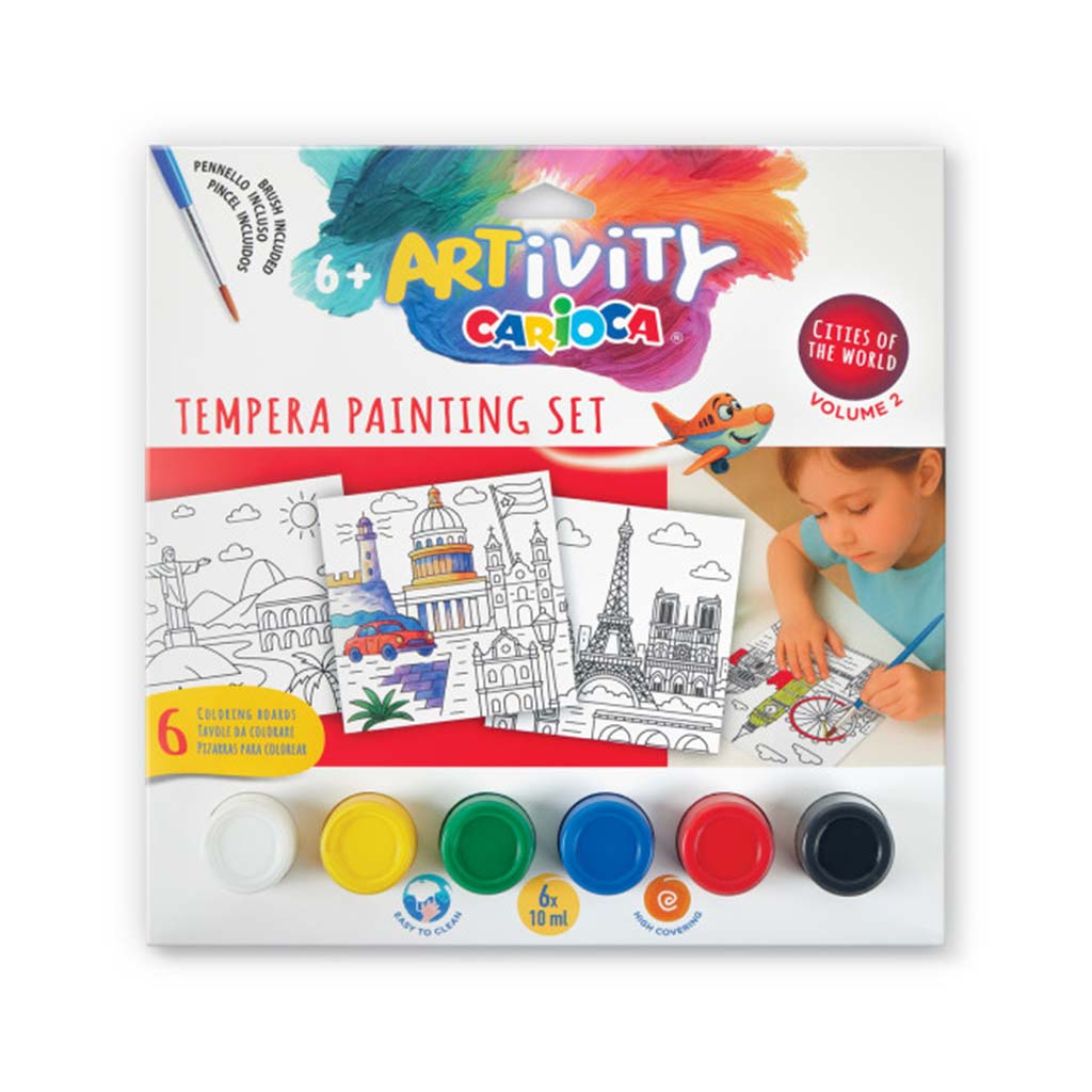 Komplet tempera barv ARTivity Carioca – z motivi Evrope – je odlična izbira, če želiš razvijati ustvarjalnost svojega otroka, medtem ko se na igriv način spoznava z znanimi kraji sveta. Drugi del serije "Cities of the World" prikazuje evropske znamenitosti, tako lahko otroci med slikanjem odkrijejo med drugim Eiffelov stolp in druge ikonične zgradbe. Vnaprej narisane podlage pripomorejo k občutku uspeha, zato lahko tvoj otrok zlahka ustvari lepe, barvite slike.