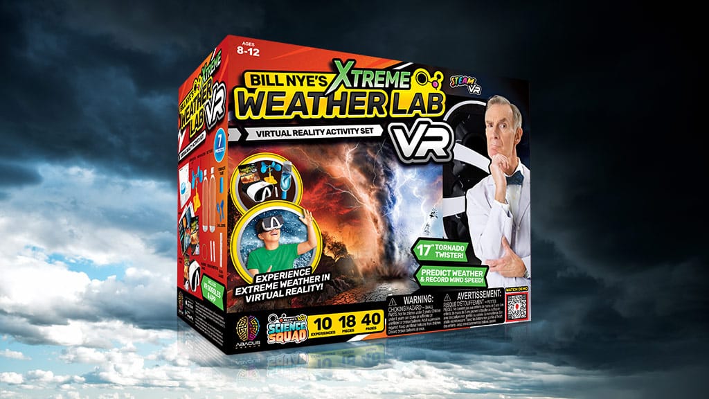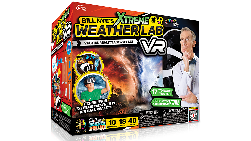 Bill Nye Extreme Weather Lab VR, zasnovan za otroke, je zabaven način za spoznavanje naravnih katastrof in njihovega delovanja. Učno doživetje je sestavljeno iz treh delov: spoznavanje naravnih katastrof s pomočjo priloženega vodnika, izvajanje poskusov s priloženimi orodji in tabelami ter doživljanje naravnih katastrof v virtualni resničnosti (VR)! Za dostop do VR elementov kompleta morajo otroci prenesti aplikacijo Bill Nye VR Science Squad na telefon ali podobno napravo. Nato lahko s pomočjo aktivacijske kode, ki je navedena v vodniku, otroci odklenijo segment Xtreme Weather VR. Otroci lahko telefon vstavijo v priloženo VR slušalko, da doživijo nevihte, plazove in druge katastrofe v virtualni resničnosti, ali pa izkušnjo delijo s prijatelji v celozaslonskem načinu.