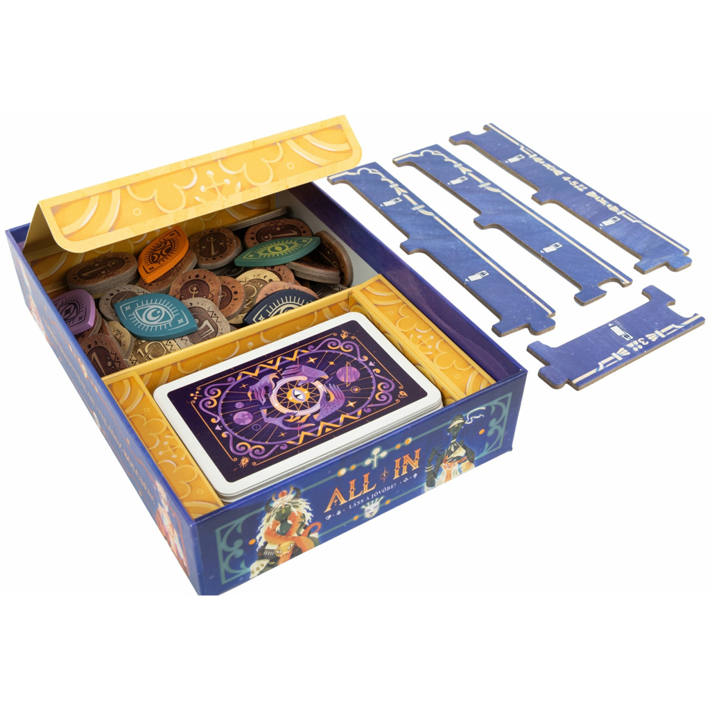 Družabna igra All In – Poglej v prihodnost! je razburljiva in posebna kartaška igra, v kateri lahko skupaj s svojim otrokom poskušata razvozlati poteze nasprotnikov in razmišljati vnaprej. Vpadljive, mistične ilustracije vas takoj potegnejo vase, igra pa vas nenehno postavlja pred odločitve. Cilj je čim spretneje upravljati s svojimi kartami in žetoni ter v pravem trenutku izreči "all in".