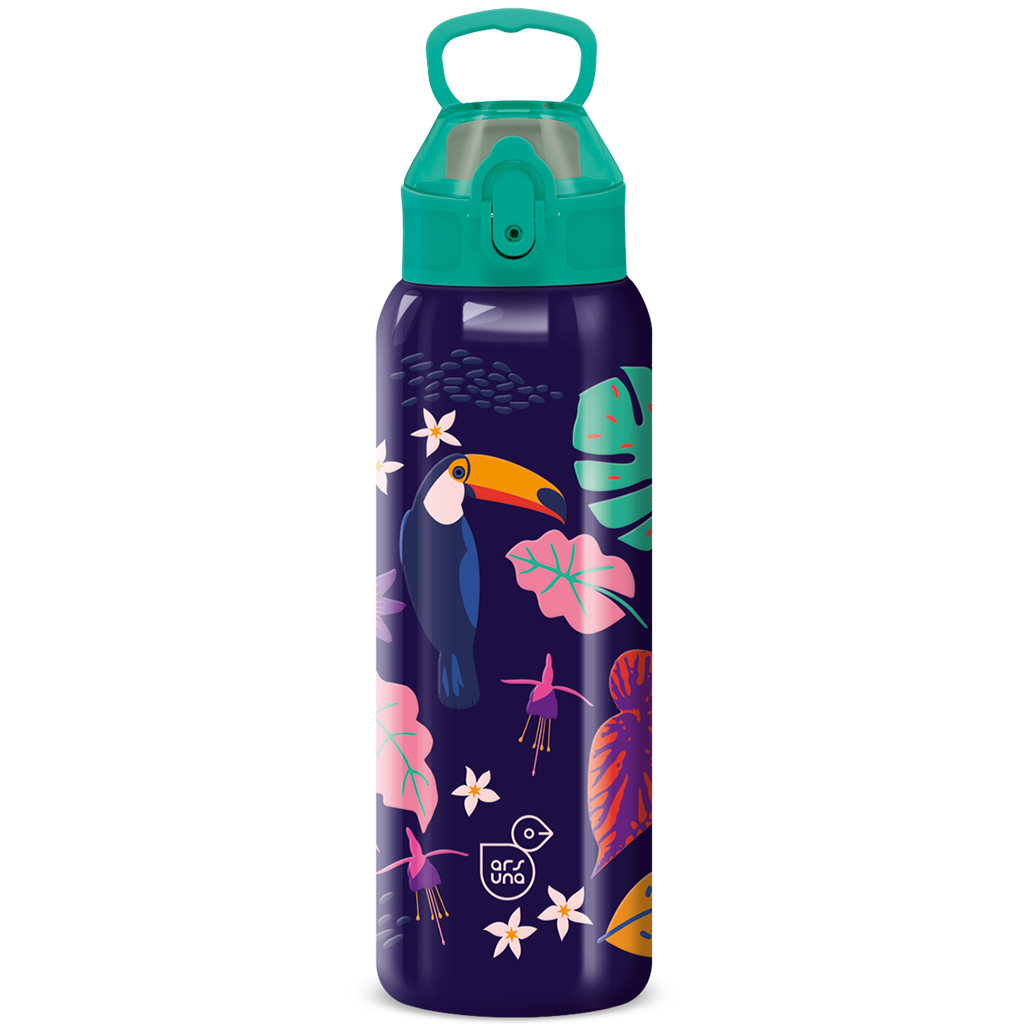 Ars Una 3D kovinska steklenica z motivom tukana in dvojno steno je popolna izbira, če za svojega otroka iščete res trpežno in privlačno steklenico. Barvni tukani in tropski vzorci na temnem ozadju dajejo edinstven, vesel videz, ki ga bodo otroci oboževali. Prostornina 700 ml je idealna za celodnevno uporabo, dvojna stena z vakuumsko izolacijo pa poskrbi, da pijače dolgo ohranijo svojo temperaturo. Praktično odpiranje z eno roko in udoben ustnik olajšata uporabo, zato je primerna za v šolo, na izlete ali za šport.