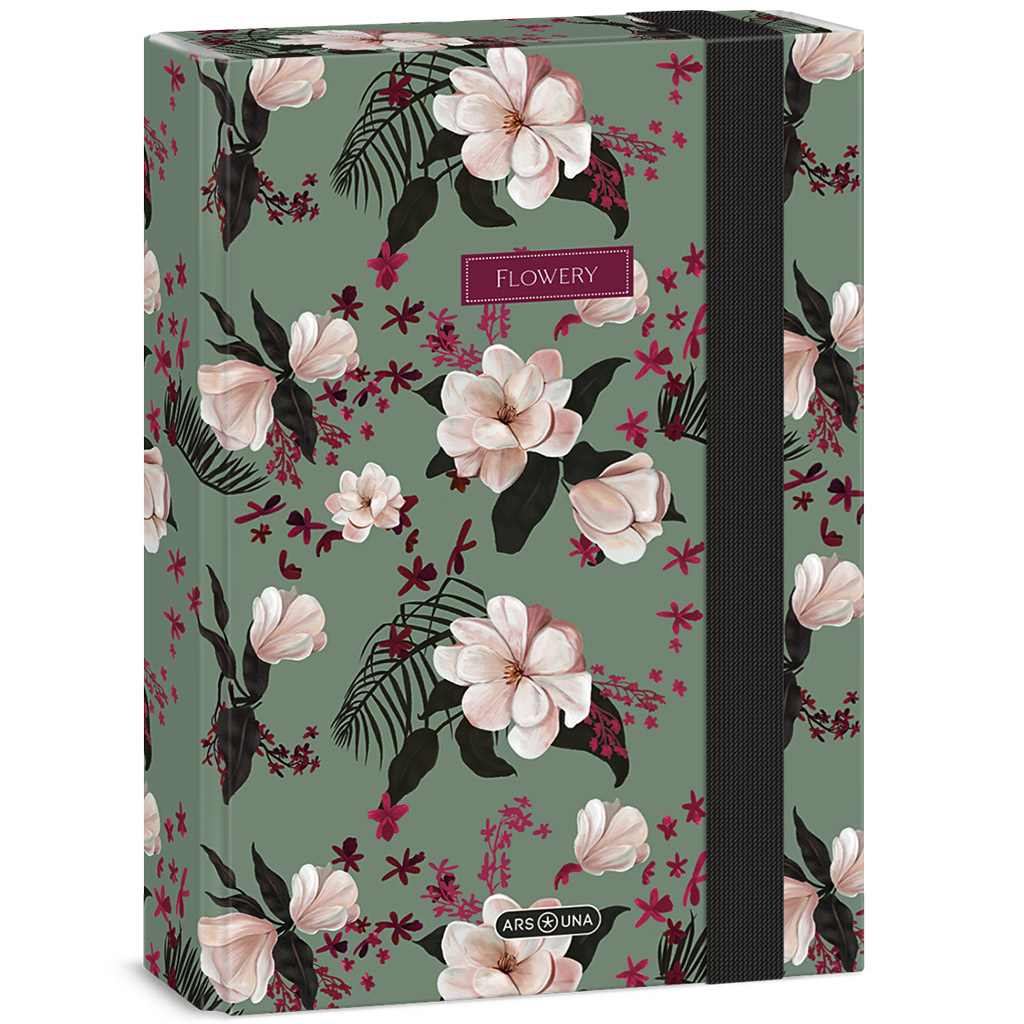 Ars Una: Flowery Green cvetlična škatla za zvezke A/5 prinaša eleganten in naraven pridih v šolski vsakdan vašega otroka. Na zeleni podlagi narejen, nežno izrisan cvetlični vzorec zagotavlja zelo stilski videz, hkrati pa ustvarja prijazen in harmoničen vtis. Masivna, trda kartonska platnica učinkovito ščiti zvezke in dokumente pred poškodbami, tako da ostanejo vedno urejeni. Zapiranje z gumico poskrbi, da iz nje nič ne more zdrsniti. Praktična izbira za v šolo, na dodatne ure ali za domačo organizacijo.
