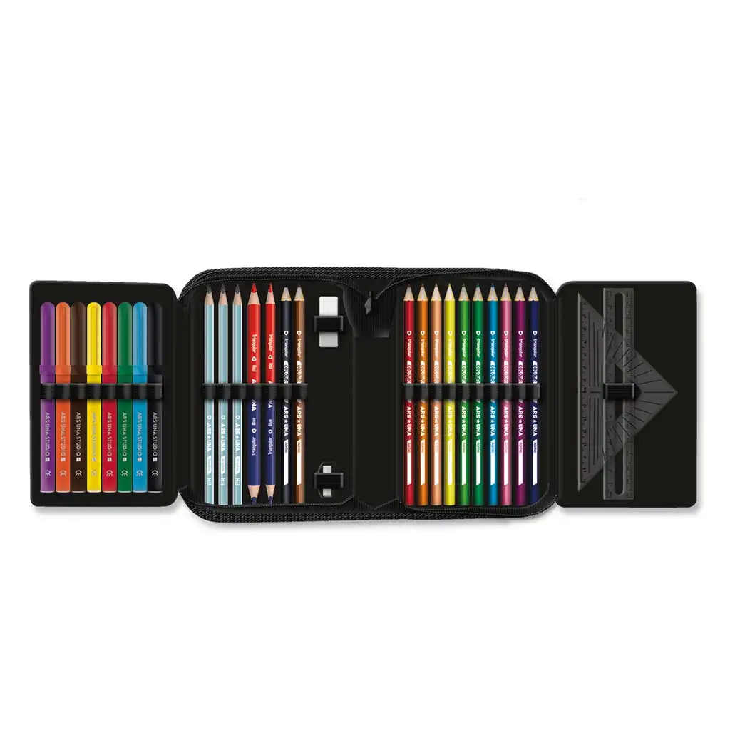 Zaradi svoje praktične notranje zasnove ni le privlačna na pogled, ampak vsebuje tudi vse potrebne pripomočke. Vsebuje 12 barvic, 3 grafitne svinčnike, flomastre, radirko, šilček ter dve vrsti ravnil. Učenci lahko s pomočjo urnika A-B tednov organizirajo tudi svoje ure. Zapira se z vzdržljivo zadrgo in se zlahka prilega v tvojo šolsko torbo.