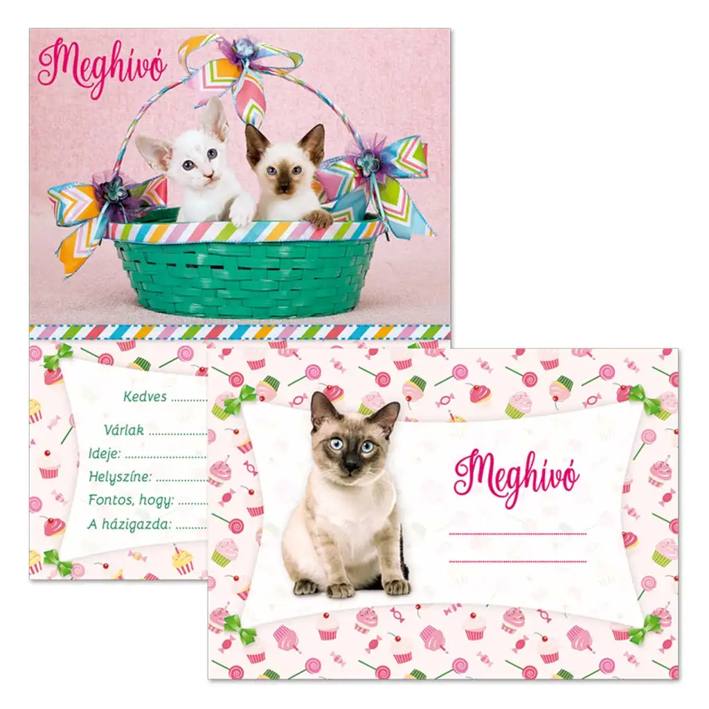 Ta 10-delni komplet vabil na zabavo je odlična izbira za vse male ljubitelje muc, ki želijo svoje prijatelje povabiti na rojstnodnevno zabavo ali drug dogodek na igriv in prikupen način. Na sprednji strani vabila iz ljubke zelene košare kukajo nasmejane mlade mucke, ki jih krasijo pisane pentlje in vesel, "cukrast" motiv v ozadju – nasmeh na obrazu vsakega povabljenca je zagotovljen!