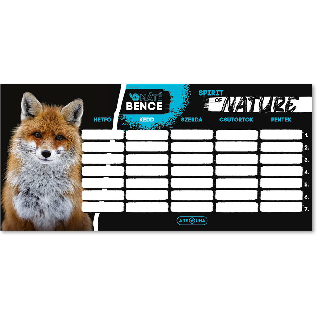Ars Una Máté Bence Spirit of Nature urnik z lisico je popolna izbira, če želite, da vaš otrok svoj teden organizira igrivo in pregledno. V privlačnem, z naravo navdihnjenem dizajnu je prikupna lisica, ki bo zagotovo poživila pisalno mizo in naredila učenje bolj motivirajoče. Enolistna, dvostranska izvedba je praktična rešitev: nanj lahko zapiše več različnih urnikov ali pa ga uporablja ločeno za šolsko in domačo razporeditev.