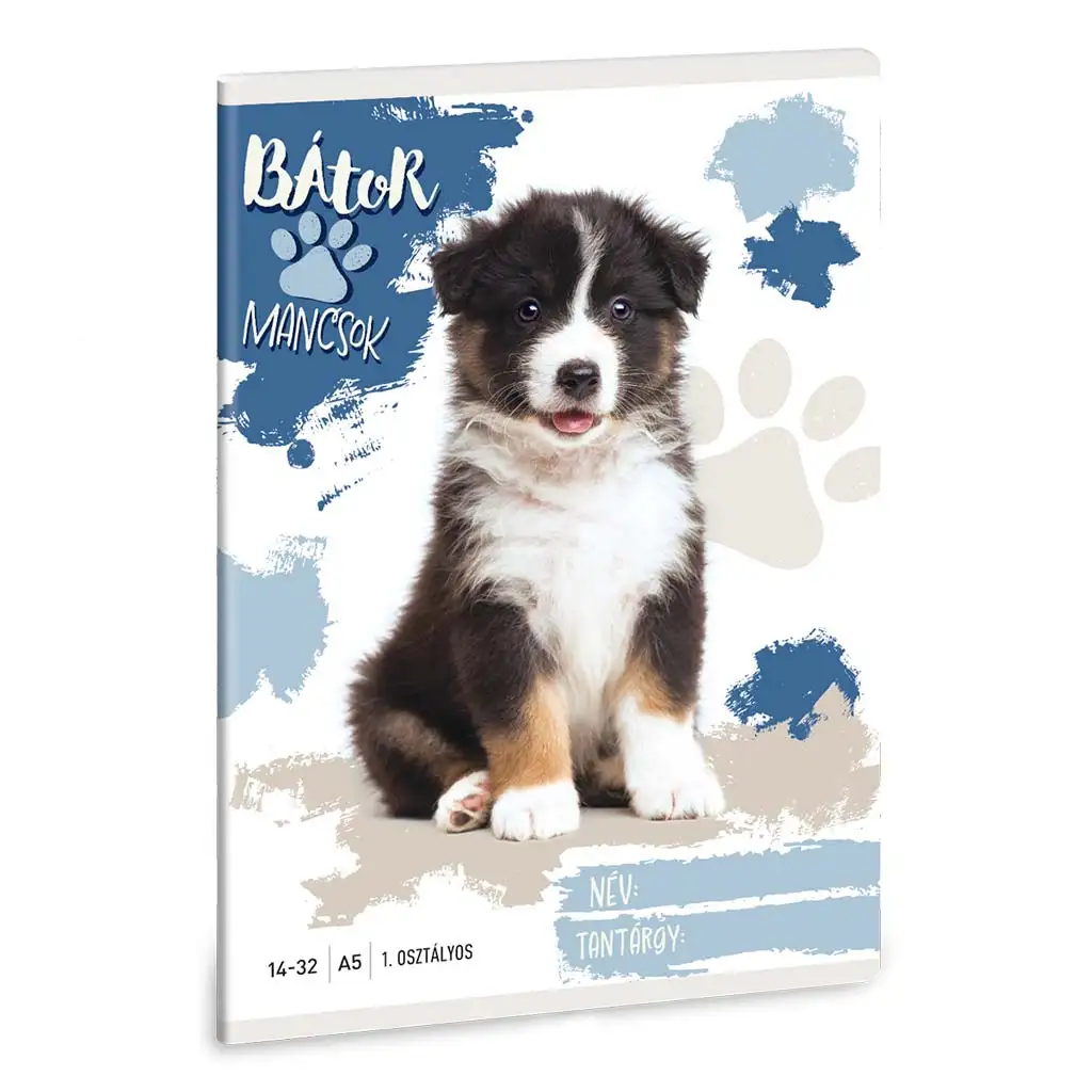 To je zvezek z vrsticami za 1. razred, ki je popolni spremljevalec pri prvih korakih učenja pisanja, še posebej če imate radi pse. Na naslovnici je prikazan prisrčen, prijazen mladiček avstralskega ovčarja, ki s svojim nasmejanim pogledom spodbuja vašega otroka k učenju in sprejemanju novih izzivov. Sodobne modre in bež barvne packe ter dizajn s pasjimi tačkami ustvarjajo veselo in prijazno vzdušje, zato je zvezek ne le praktičen, ampak tudi vir veselja za male učence.