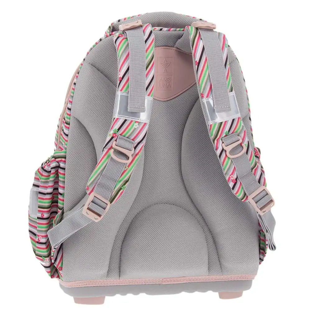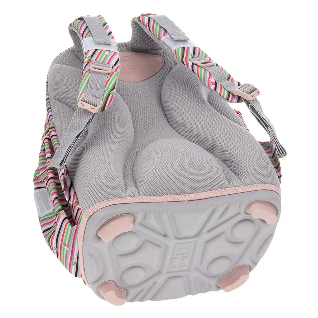 Nahrbtnik ni le čudovit, temveč tudi izjemno udoben in funkcionalen. Hrbtni del je ergonomsko oblikovan, z debelo oblazinjenim hrbtiščem in oblazinjenim ledvenim delom za celodnevno udobje. Mehke naramnice so nastavljive na več točkah, tako da se popolnoma prilagajajo otrokovemu telesu. Močan spodnji del je zaščiten s štirimi plastičnimi nogicami, zato se dno torbe ne poškoduje zlahka, tudi če jo postavite na tla. Trije prostorni predali zagotavljajo, da so vsi šolski pripomočki lepo organizirani; v največjem je tekstilna pregrada, v najmanjšem pa predalček za pisala in za dokumente. Dva stranska žepa z elastiko sta idealna za steklenico ali drobnarije, odsevni elementi pa poskrbijo za večjo varnost v prometu.
