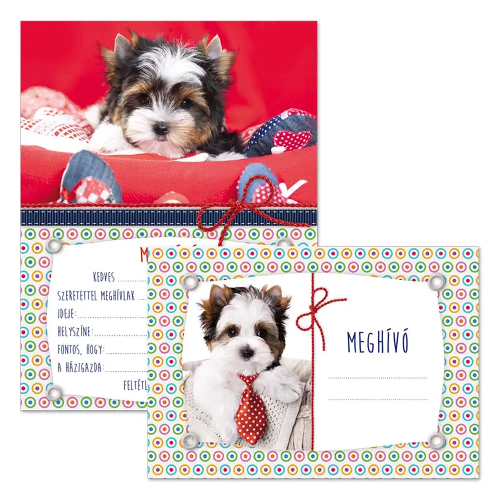 Kužkov komplet vabil z ovojnicami – 10 kos – je srčen način, da vaš otrok na stilski in prisrčen način povabi svoje prijatelje na prihajajoči rojstni dan ali drugo posebno priložnost. Na naslovnici vabila nas pozdravi prikupen kužek, ki počiva v rdeči postelji in se smehlja, medtem ko v notranjosti malega gosta z metuljčkom prijazno povabi na zabavo – ob tem vsak otroški srček zagotovo odlepi!
