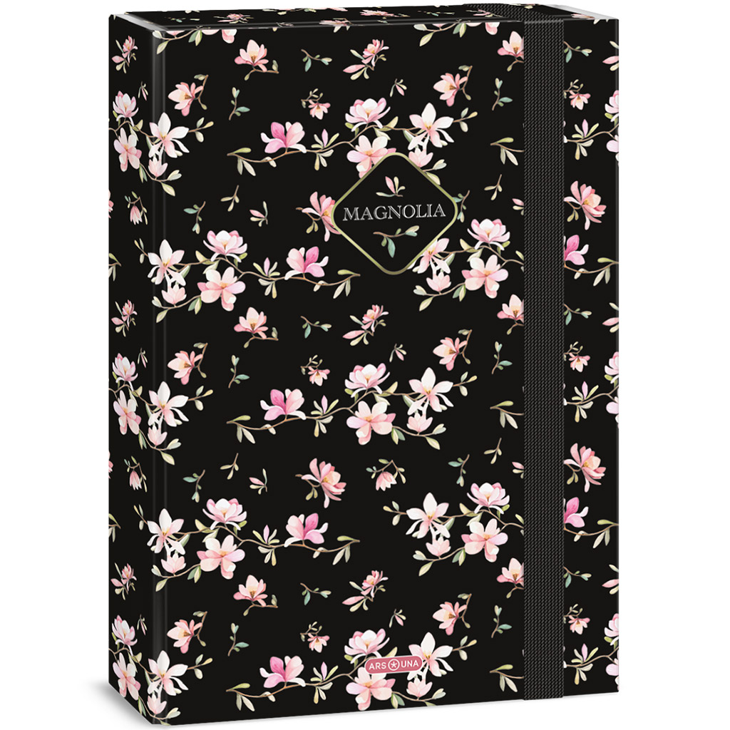 Ars Una: škatla za zvezke A4 z motivom magnolije je elegantna in praktična rešitev, da bo šolska oprema vašega otroka vedno urejena in zaščitena. Nežni cvetovi magnolije na črnem ozadju dajejo izjemno eleganten videz, zato je škatla idealna za tiste, ki imajo radi čiste, a hkrati posebne vzorce. Velik A4 format je idealen za shranjevanje delovnih zvezkov, risb in pomembnih dokumentov ter jih varuje pred gubami. Trpežen, trd kartonast ovoj zagotavlja dolgotrajno zanesljivost, močna gumica pa škatlo varno zapira.