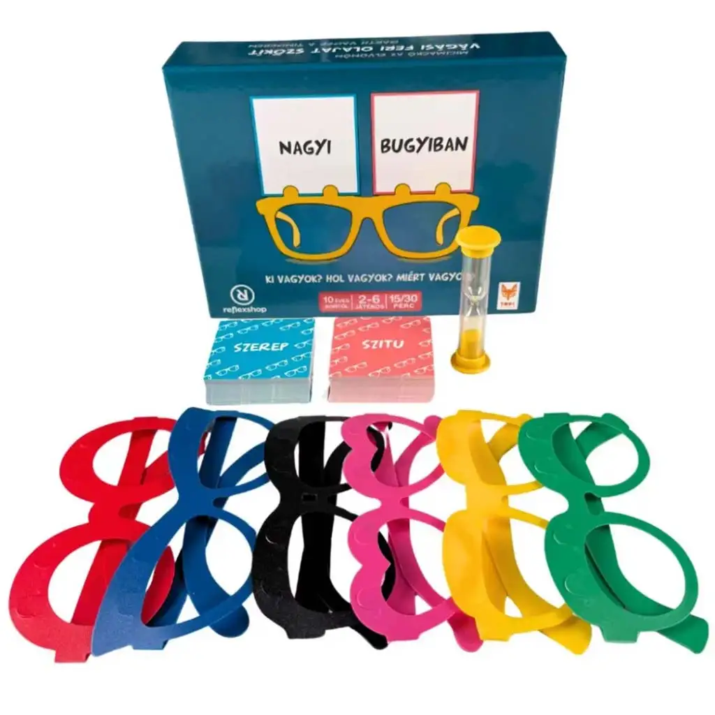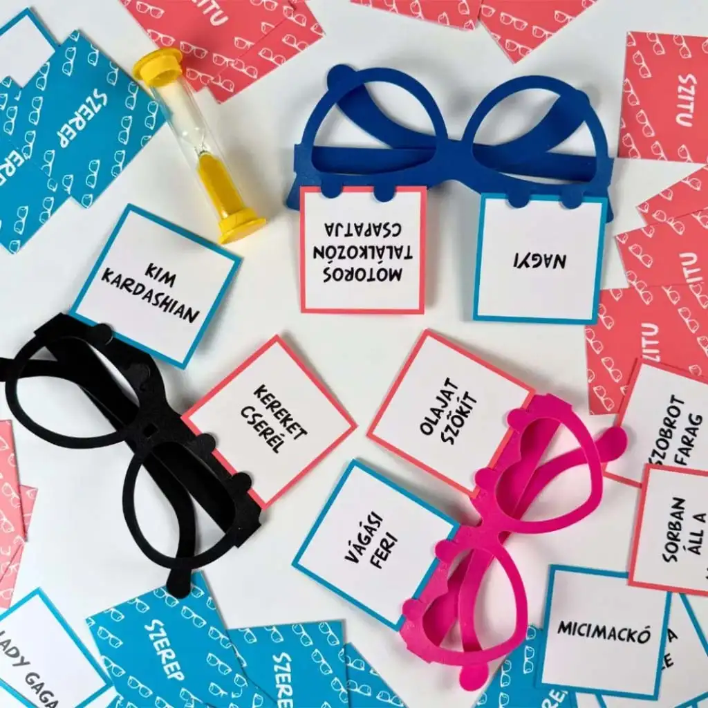 - Vsebina škatle: 50 kart z vlogami, 50 kart s situacijami, 24 praznih kart, 6 očal, 1 peščena ura, 1 knjižica s pravili