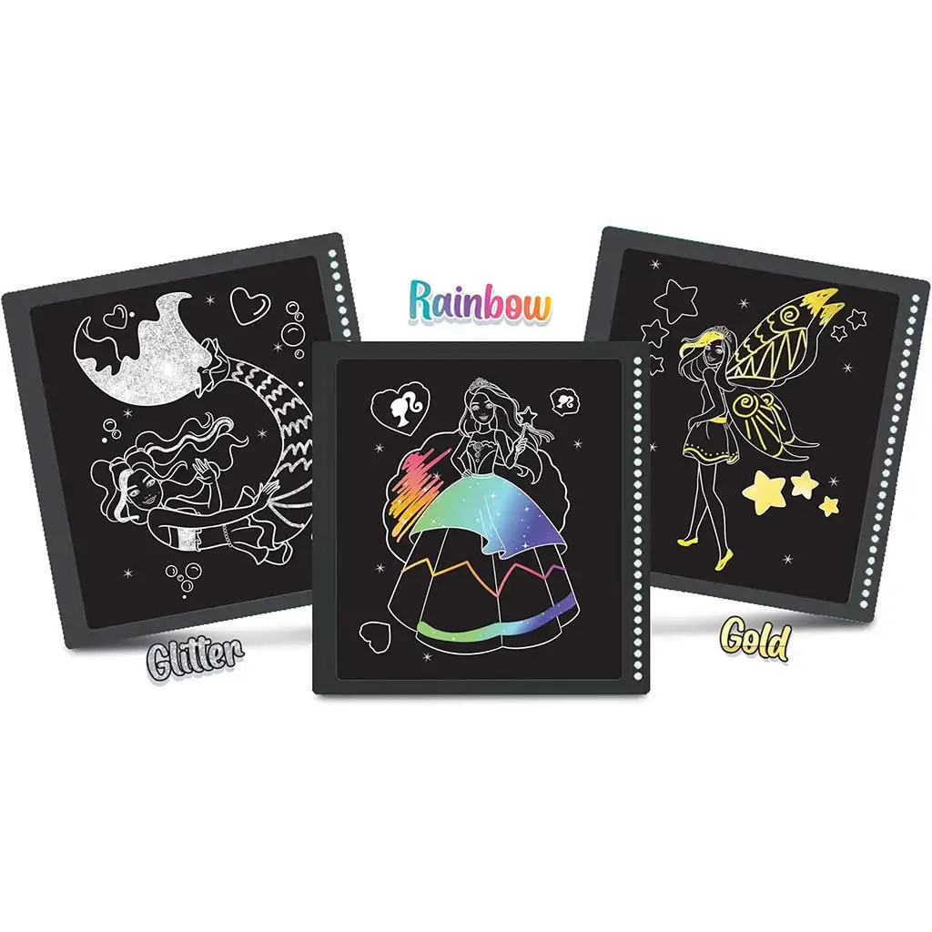 Barbie Mer-Mazing komplet za ustvarjanje s praskanjem slik je sanje vsakega otroka, ki obožuje ustvarjalnost, bleščice in seveda Barbie! 44-stranska spiralno vezana knjiga za praskanje je polna presenečenj z morsko tematiko, kjer morske deklice, samorogi, vile in princese čakajo, da jih otroške roke oživijo. Črne strani je treba praskati s posebno plastično strgalko, pri čemer se z vsakim potegom pojavijo čarobne barve – kot so zlata, bleščeča ali mavrična.