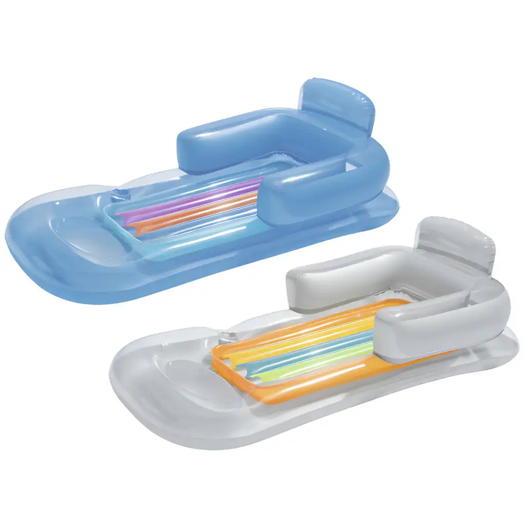 Naslonite se nazaj in se sprostite na površini vode s tem udobnim ležalnikom, ki ima naslonjalo za roke in hrbet. Ležalnik z naslonjalom je izdelan iz prozorne plastike z barvnim okrasjem, ki mu daje stilski videz.