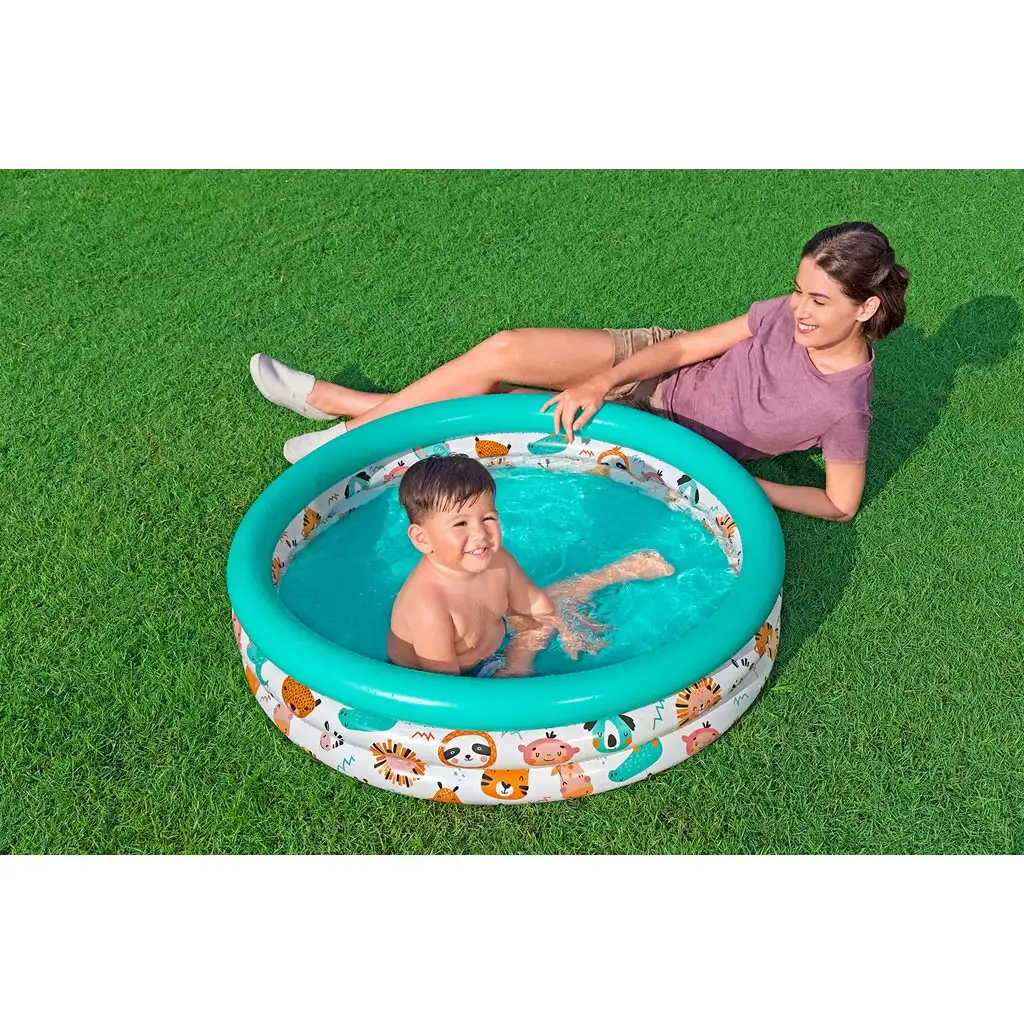 Bazen krasijo barvite, živalske poslikave, ki niso le privlačne na pogled, temveč tudi spodbujajo otroke h igri. Lev, lenivec, žirafa, panda in druge prikupne živalske figure gledajo iz sten bazena, tako da je vsako kopanje nova pustolovščina. Trikraten napihljiv obroč zagotavlja mehek, varen in udoben rob, na katerega se med igro lahko naslonijo ali počivajo.