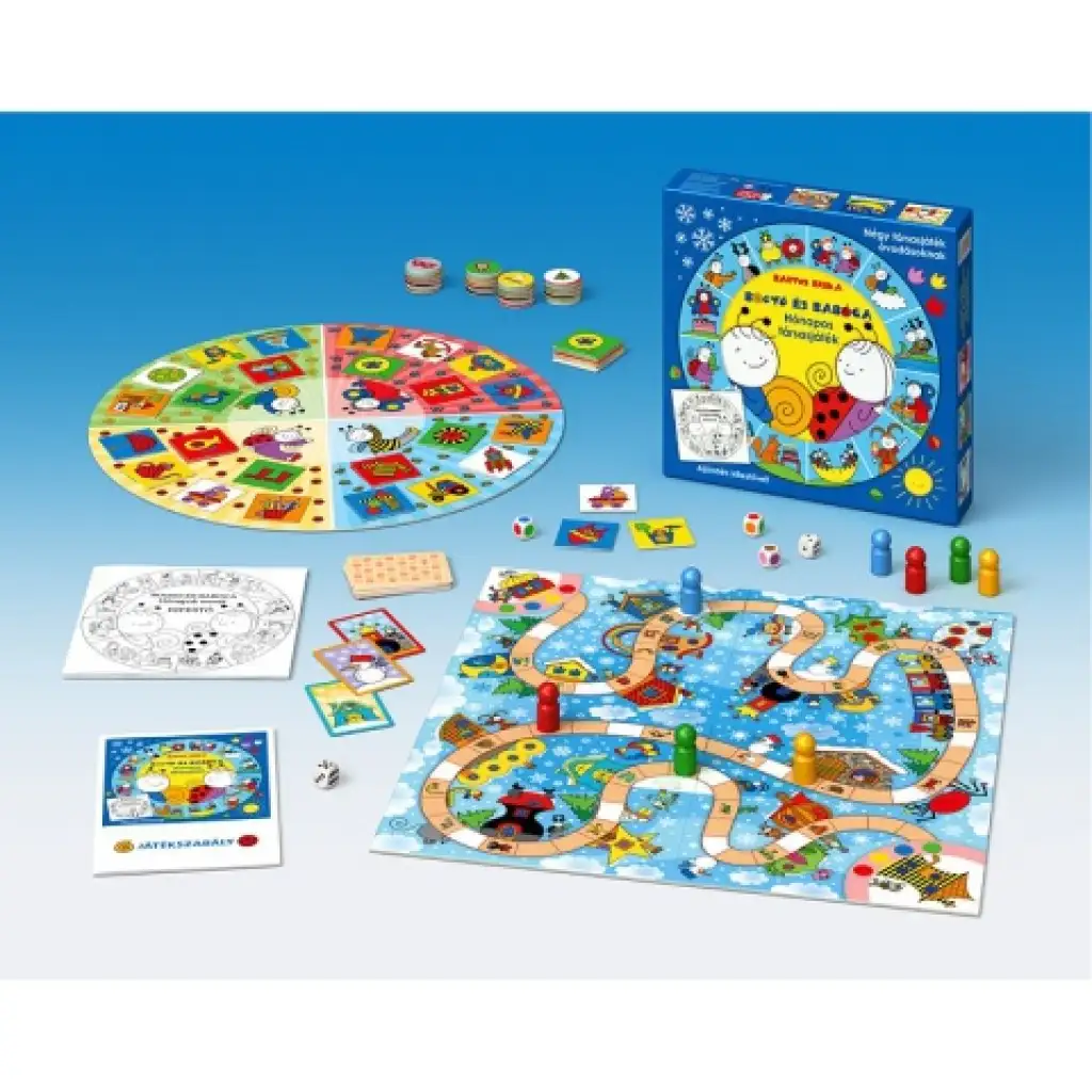 Ta čudovita družabna igra vsebuje štiri igre, ki so bile vse posebej zasnovane za predšolske otroke. Igra je ilustrirana s prijaznimi liki in barvitimi prizori iz zgodbe Bogyó in Babóca, ki jo je ustvarila Bartos Erika. Preprosta pravila so razumljiva tudi za najmlajše. V prvih dveh igrah morajo prepoznati barve in ujemati slike. Tretja igra vodi skozi letne čase, medtem ko v četrti spremljajo Piheja do Baltazarja skozi zimski gozd. Preprostejše igre vključujejo barvne kocke, prilagojene starostni skupini.