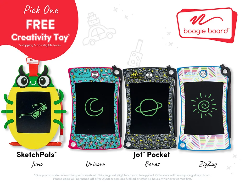 Družine lahko izbirajo med Sketch Pals Doodle Board ali Jot Pocket tablico, mini tablo za pisanje, ki je idealna za ročno prtljago, na voljo v treh zabavnih vzorcih: Unicorn, Bones ali Zigzag.*Ponudba velja samo na ameriškem trgu, 48 ur ali dokler se ne zahteva prvih 2.000 izdelkov