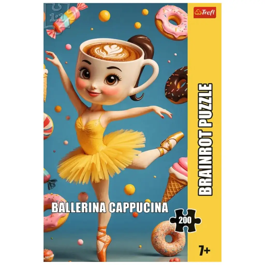 Potopite se v edinstven svet Brainrot s to zabavno in ustvarjalno sestavljanko s 200 deli! Balerina Capuccina je resnično edinstvena, igriva slika: prikupna balerina, katere glava je skodelica, napolnjena s kapučinom – vse to obkrožajo pisani krofi, sladkarije in bonboni.