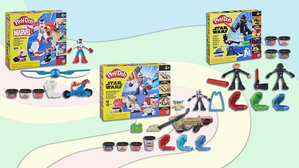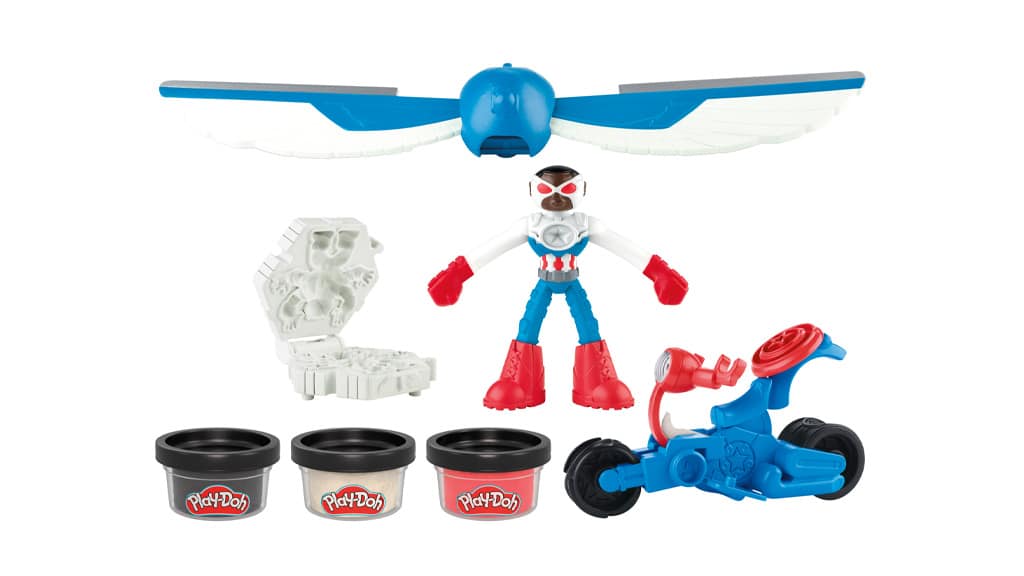 Ta komplet vsebuje več oblik in štiri mini posodice Play-Doh gline, ki so na voljo v zelenih, črnih, belih ter mešanici rdečih in modrih barv. Otroci lahko z uporabo priloženih oblik ustvarijo Play-Doh plašč za figuro Darth Vaderja, oblikujejo pas Lukea Skywalkerja, oblikujejo Play-Doh "svetlobni meč" in celo ustvarijo svojega mehkega R2D2. Ta kreativna igra otrokom omogoča, da se potopijo v svet Vojne zvezd, medtem ko razvijajo svojo ročno spretnost in domišljijo. S kombiniranjem različnih barv in oblik se pred njimi odpirajo neskončne možnosti za ustvarjanje novih dogodivščin v galaksiji.Ta komplet vsebuje figuro Sama Wilsona kot prilagodljivega Kapitana Amerike. Otroci lahko figuro pritrdijo na motorno kolo (njegove roke se celo povežejo z volanom), motorno kolo pa lahko potiskajo po barvitem Play-Doh-u, da ustvarijo zvezde, in ga tudi režejo! Otroci lahko uporabijo tudi kalupe za ustvarjanje zlikovcev ali pritrdijo 2-v-1 krila na Kapitana Ameriko.