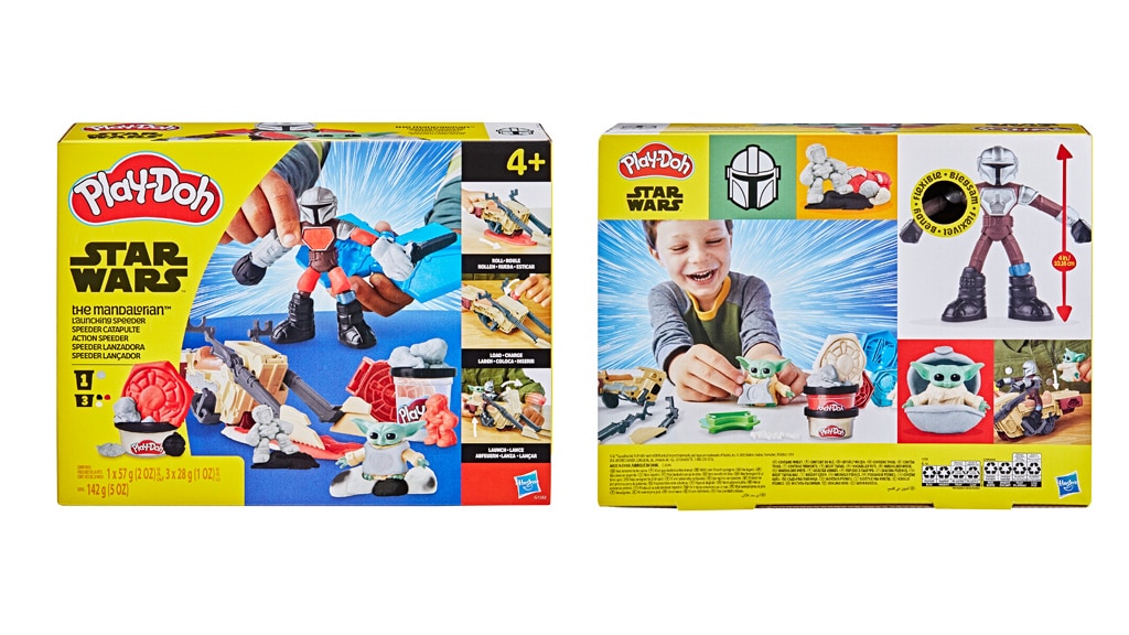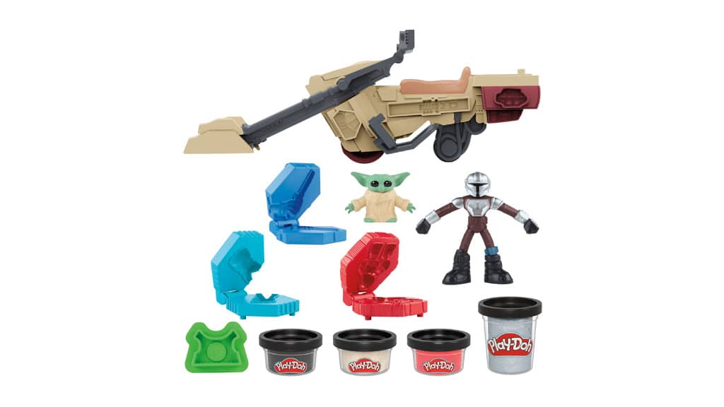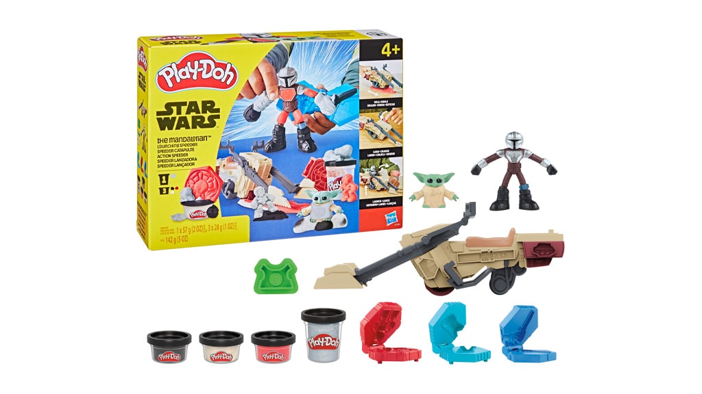 Otroci lahko s priloženim Speederjem valjajo Play-Doh plastelin, da izdelajo strelivo, nato pa ga naložijo v Speeder in izstrelijo (seveda pod vodstvom Mandaloriana in Groguja). Vozilo deluje tudi kot orodje – otroci ga lahko razstavijo in uporabijo dele za rezanje in oblikovanje Play-Doh plastelina. Set vključuje tudi kalupe za Mandalorianov oklep, Grogujev oklep ter za drugega lika, da bo domišljijska igra še bolj razburljiva!