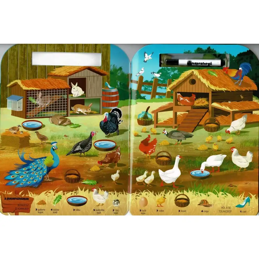Na slikah v knjigi oživijo živali, predmeti in vsakdan na kmetiji. Otroci morajo s priloženim flomastrom poiskati in obkrožiti določene elemente. Igra ni le zabavna, ampak razvija tudi opazovanje, koncentracijo in vizualno zaznavanje.