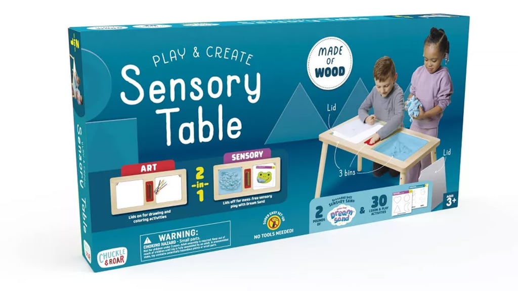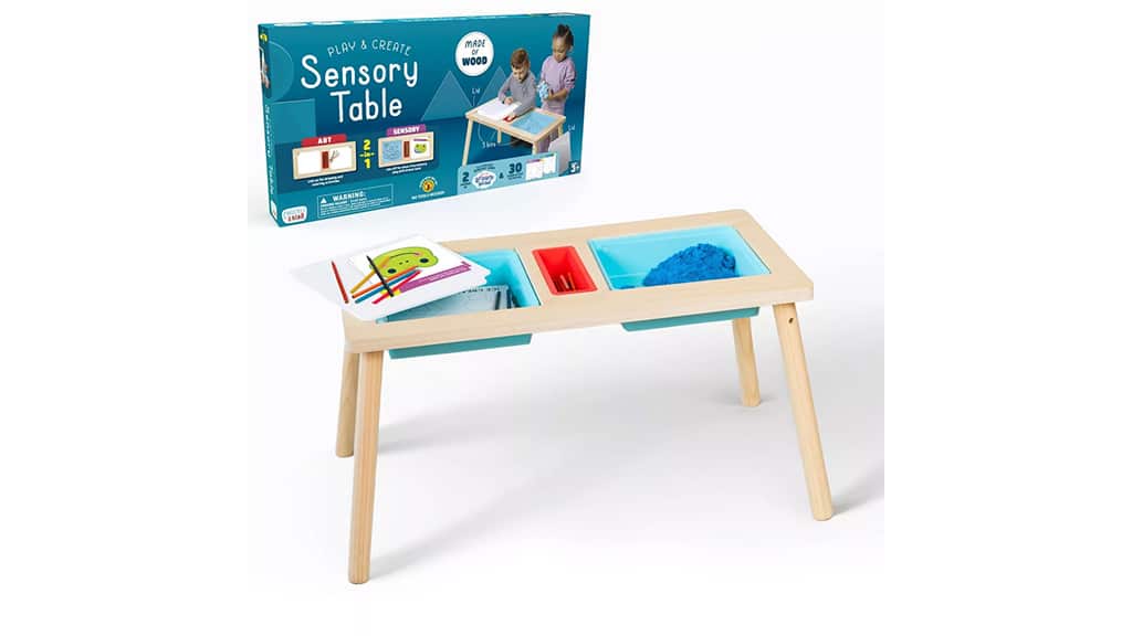 Buffalo Games Play & Create Senzorična miza je dvov v enem, otrokom prilagojena lesena miza s tremi predali za igro in shranjevanje. Miza vključuje Sanjski pesek, ki je pomirjujoč, mehak, kinetični pesek, tri suhe brisljive flomastre ter 30 učnih dejavnosti za zabavo brez nereda. Play & Create Senzorična miza je namenjena otrokom, starim 3 leta in več.