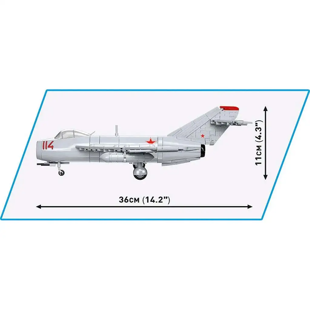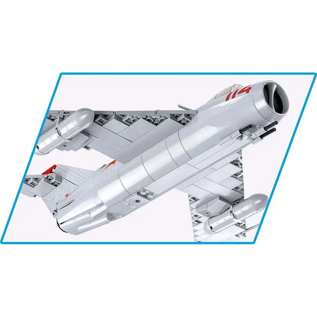 Stavebnica lovskega letala COBI MiG-17 prikazuje eno najbolj znanih sovjetskih bojnih letal iz obdobja hladne vojne, ki je služilo v zračnih silah 40 držav po vsem svetu. MiG-17 je bil dokončan leta 1949, kmalu zatem pa se je začela serijska proizvodnja. Letalo je enosedežni, enomotorni lovec s srednje nameščenimi krili in poševnimi krili s tremi usmerjevalnimi ploščami na vsakem krilu. Njegova značilna oblika vključuje dovod zraka v nosnem delu, ki ga razdeli navpična pregrada na dva kanala. Stalna oborožitev MiG-17 je sestavljena iz dveh topov NR-23 kalibra 23 mm in enega topa N-37D kalibra 37 mm, poleg tega pa je mogoče pritrditi tudi bombe in dodatne rezervoarje. Ena najbolj znanih različic tega tipa je bil LIM-5, ki so ga proizvajali na Poljskem.