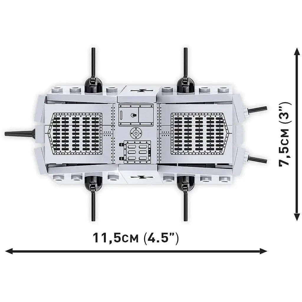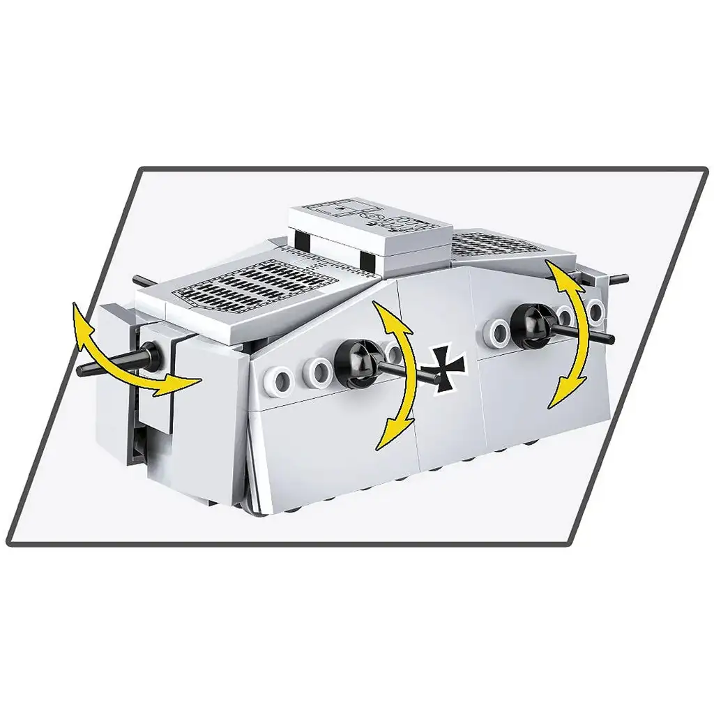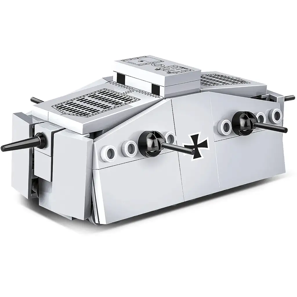 Gradbeni komplet COBI Sturmpanzerwagen A7V prikazuje eno izmed najbolj posebnih oklepnih vozil prve svetovne vojne. A7V je bil edini nemški tank, ki so ga v tem obdobju serijsko proizvajali, izdelali pa so le dvajset primerkov. Zaradi svojih ogromnih dimenzij in značilnega oklepnega trupa je postal eden najbolj prepoznavnih bojnih vozil tega časa. Model je izdelan v merilu 1:72, sestavljen je iz 119 visokokakovostnih gradbenih elementov, končno vozilo pa meri 11,5 cm v dolžino, 7,5 cm v širino in 4,5 cm v višino.