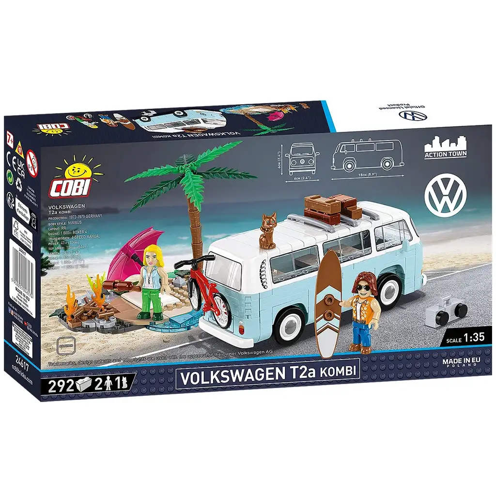 COBI Volkswagen T2a Kombi gradbeni set oživlja značilno različico legendarnega „Bulli” avtobusa, Kombi, v obliki kock. Model v merilu 1:35 je sestavljen iz 292 gradbenih elementov in natančno prikazuje obliko ter značaj izvirnega vozila. Med dodatki je mini diorama na temo plaže: detajl s peskom, palma, taborni ogenj, žar s slanino, senčnik, brisača, deska za deskanje, kovček, retro stereo kasetofon in prikupen mucek – za pravo poletno avanturo.