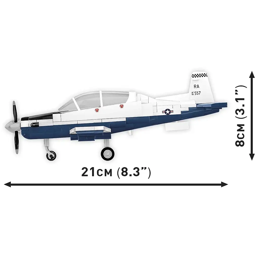 Ta komplet COBI prikliče model svetovno znanega šolskega letala Beechcraft T-6 Texan II, ki ga za usposabljanje pilotov uporablja letalstvo številnih držav. Model je izdelan v posebni modro-beli barvni kombinaciji, ki še bolj poudari elegantno obliko letala. Sestavite ga lahko v merilu 1:48, vsebuje pa skupno 197 visokokakovostnih gradbenih elementov. Mere modela zvesto sledijo originalu: dolžina 21 cm, razpon kril 21,5 cm, višina 8 cm.