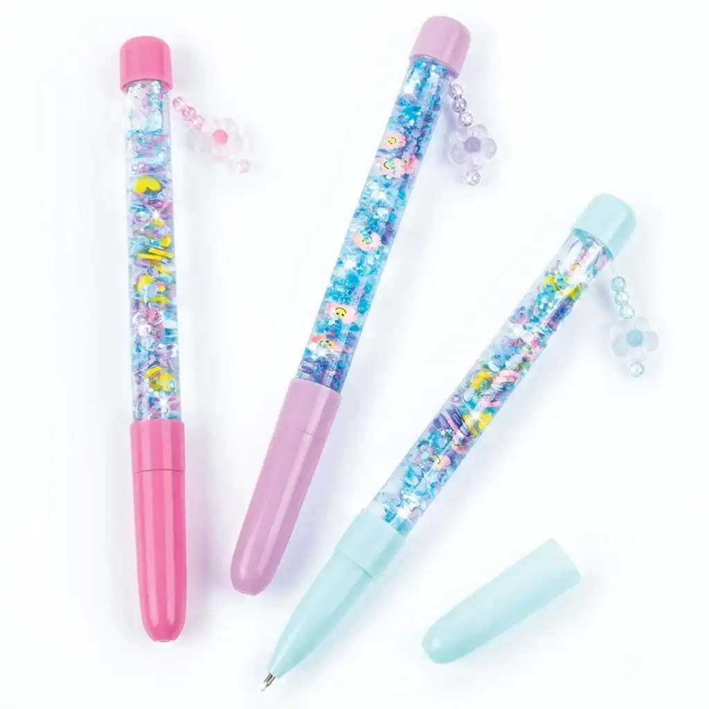 V prosojnem ohišju pisala plavajo bleščice, ki se ob vsakem gibu zableščijo, zato je pisanje in risanje z njim prav posebno doživetje. Ohišje krasijo prikupne figure Cutie Crew – srečaš lahko simpatične mucke, mlečne škatle, krofe ali male vesoljčke. Pokrovček in spodnji del pisala sta v živih barvah (modra, roza ali vijolična), kar daje pisalu še bolj barvit in igriv videz.