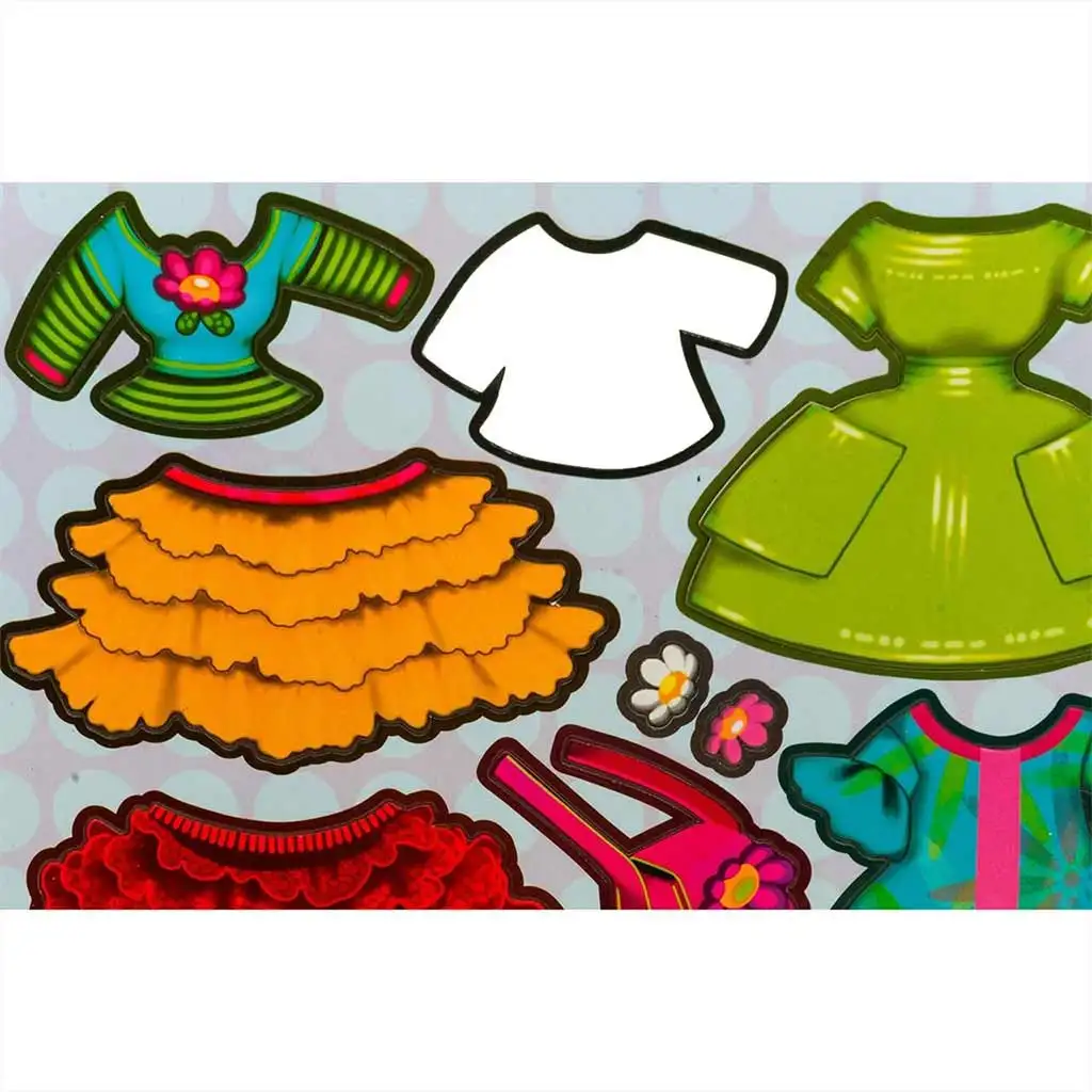 - Dva lista magnetnih nalepk z mnogimi kosi oblačil in dodatki