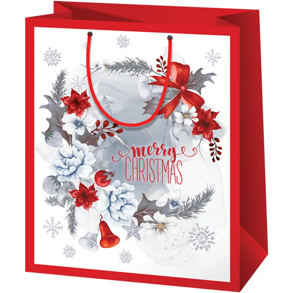 Ta rdeča-bela darilna vrečka Cardex je popoln dodatek za božično obdarovanje! Čudovito oblikovan vzorec z zvončki, snežinkami in prazničnimi cvetovi vrečki daje pravo praznično čarobnost, medtem ko napis "Merry Christmas" naredi embalažo posebno. Klasična rdeče-bela barvna kombinacija in prefinjeni grafični elementi stilsko poudarijo vrečko, tako da obdarovanec že ob prvem pogledu začuti praznično vzdušje. Velikost 17x10x23 cm je idealna izbira za manjša presenečenja, kot so kozmetika, dodatki ali okusne čokolade. Močni ročaji iz trpežnega materiala omogočajo udoben in varen transport, zato ste lahko prepričani, da bo vaše darilo prispelo na cilj v elegantni in skrbno oblikovani obliki.