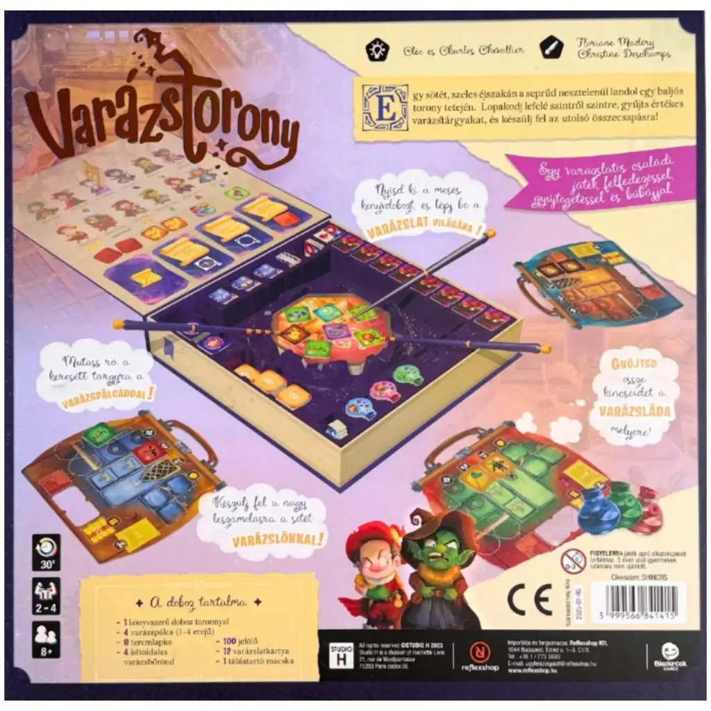 Čarobni stolp je taktična, a hkrati enostavno naučljiva družabna igra, skrita v pravljični knjižni škatli, kjer se odpravljate na pustolovščino po skrivnostnem, zlobnem stolpu. S stopnjevanjem po nadstropjih tiho preiskujete sobe, zbirate dragocene čarobne predmete in se pripravljate na zadnji spopad s temnimi čarovniki v kripti. Vsak krog izberete označevalec, ki ga želite pridobiti, nato pa ga hkrati pokažete s svojo čarobno paličico – pravilno časovno usklajevanje in tveganje se nagradita z zlatom, sestavinami, orožji in urokih.