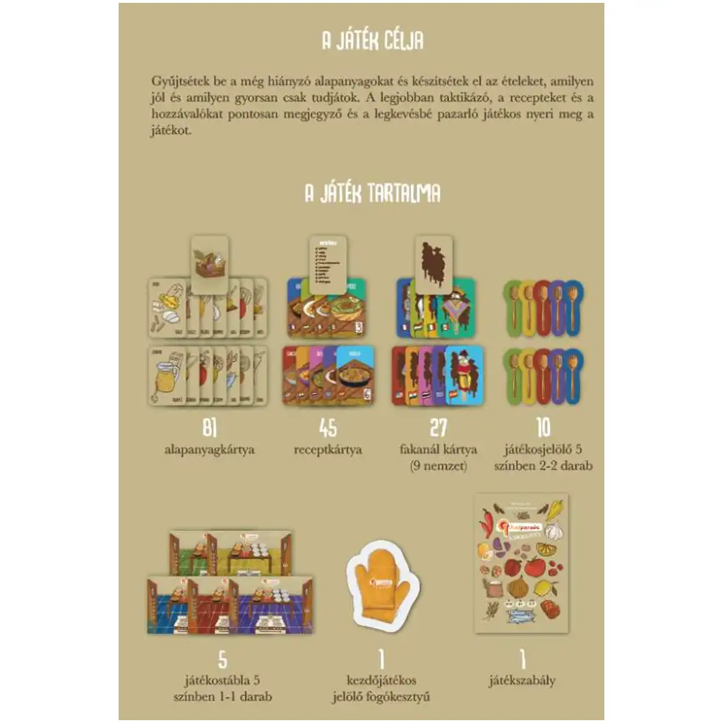 Posebnost Chefparade igre je v tem, da ne le zabava, temveč tudi razvija logično razmišljanje otrok, krepi njihovo koncentracijo in jih na igriv način uvaja v svet zdrave prehrane. Čudovite ilustracije in barvite komponente naredijo igro še bolj prijetno, pri čemer je vsak posamezen element plod madžarskega razvoja, ustvarjenega z ljubeznijo in skrbnostjo.