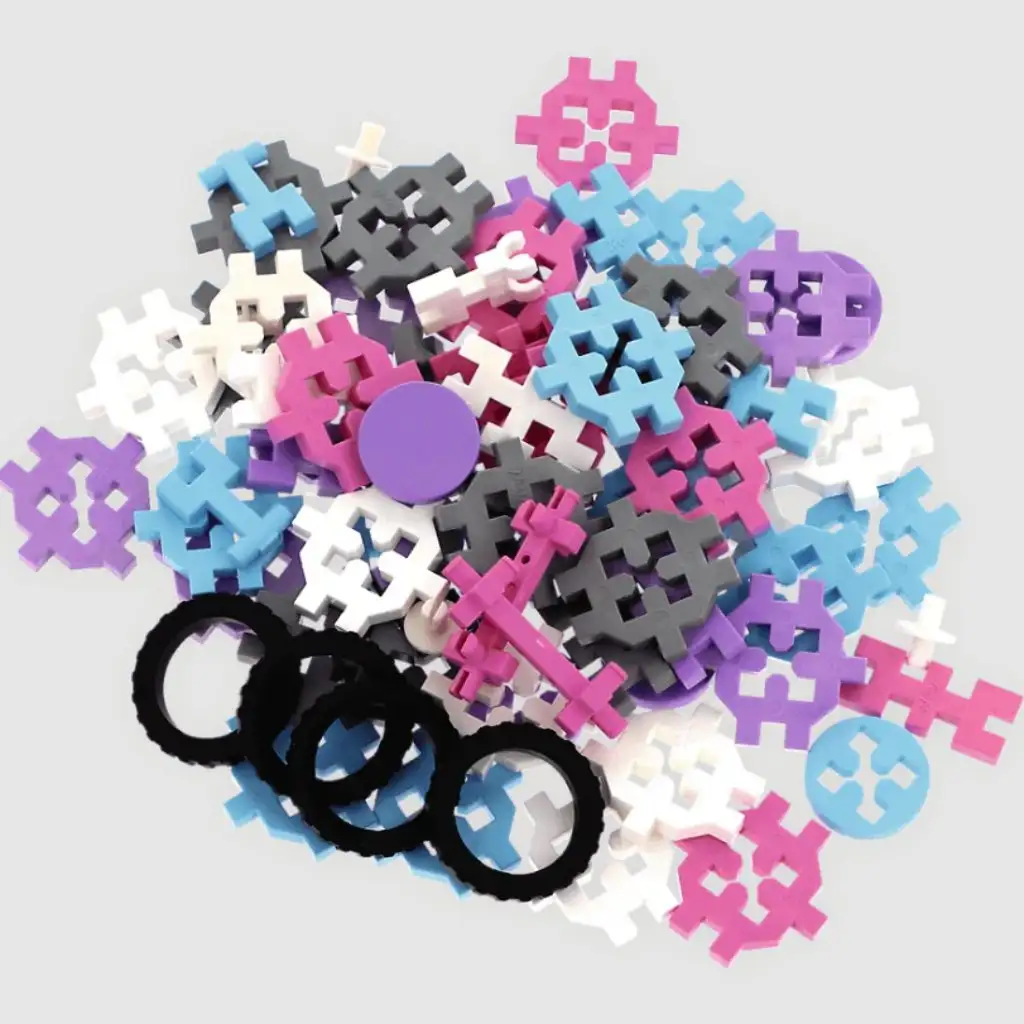 Ta set vsebuje elegantne, pastelne elemente, ki jih je enostavno povezati in razstaviti. Otroci se skozi igro učijo o svetu oblik, barv in struktur, medtem ko pri svojih stvaritvah lahko izmišljajo lastne zgodbe.