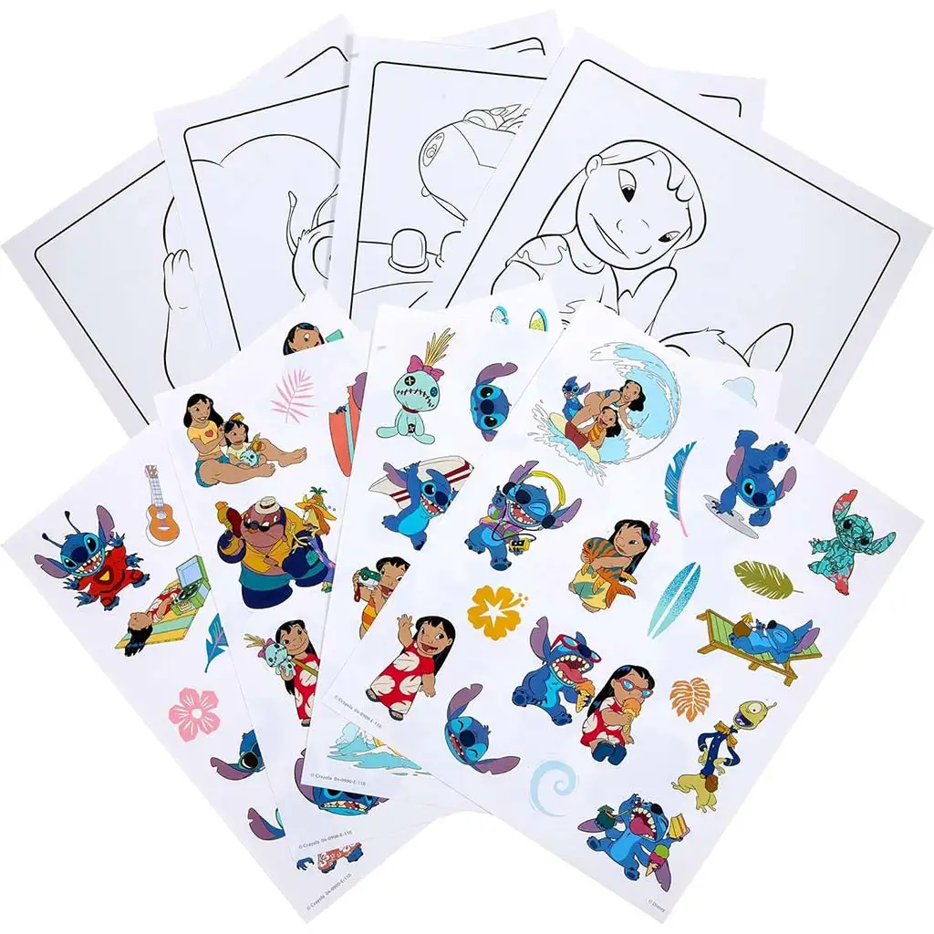 Na štirih barvnih listih z nalepkami so priljubljeni prizori in liki, kot so Stitch na deski za deskanje, Lilo, ki objema, ali nagajivi vesoljec med akcijo. Nalepke je enostavno odlepiti in ponovno prilepiti, zato lahko otroci med igro znova in znova ustvarjajo nove prizore. Strani za barvanje imajo preproste poteze, zato so popolne že za otroke od 3. leta dalje, tudi za samostojno ustvarjanje.