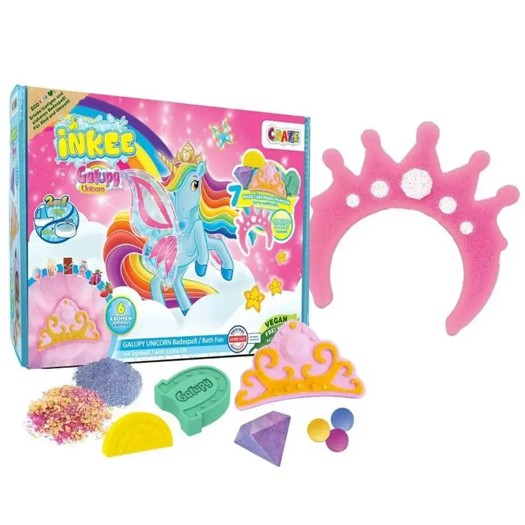 Naredite kopanje resnično čarobno z velikim kompletom kopalnih bomb Craze Inkee Galupy Unicorn, ki je sanje vsakega malega oboževalca samorogov! Ta osupljiv, barvit komplet ne ponuja le preprostega kopalnega doživetja, temveč pravo pustolovščino, polno dišav, presenečenj in ustvarjalne zabave.