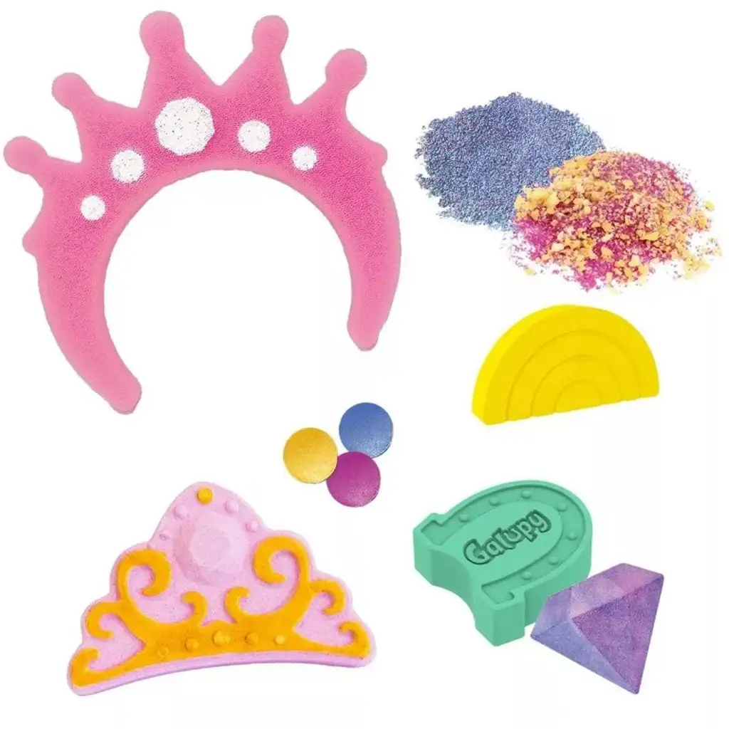 V paketu je 7 različnih kopalnih presenečenj, vključno s kopalno bombo v obliki krone z vonjem po sladkarijah, šumečo kopalno soljo z aromo jagod, sadnimi kopalnimi biseri, mavrično kopalno ploščo in še veliko več! Vsak kos s svojo posebno obliko, barvo in vonjem pričara pravo doživetje večernega kopanja. Posebnost kompleta je tudi zlata krona, s katero se otroci lahko počutijo kot pravi kopalni princ ali princesa!