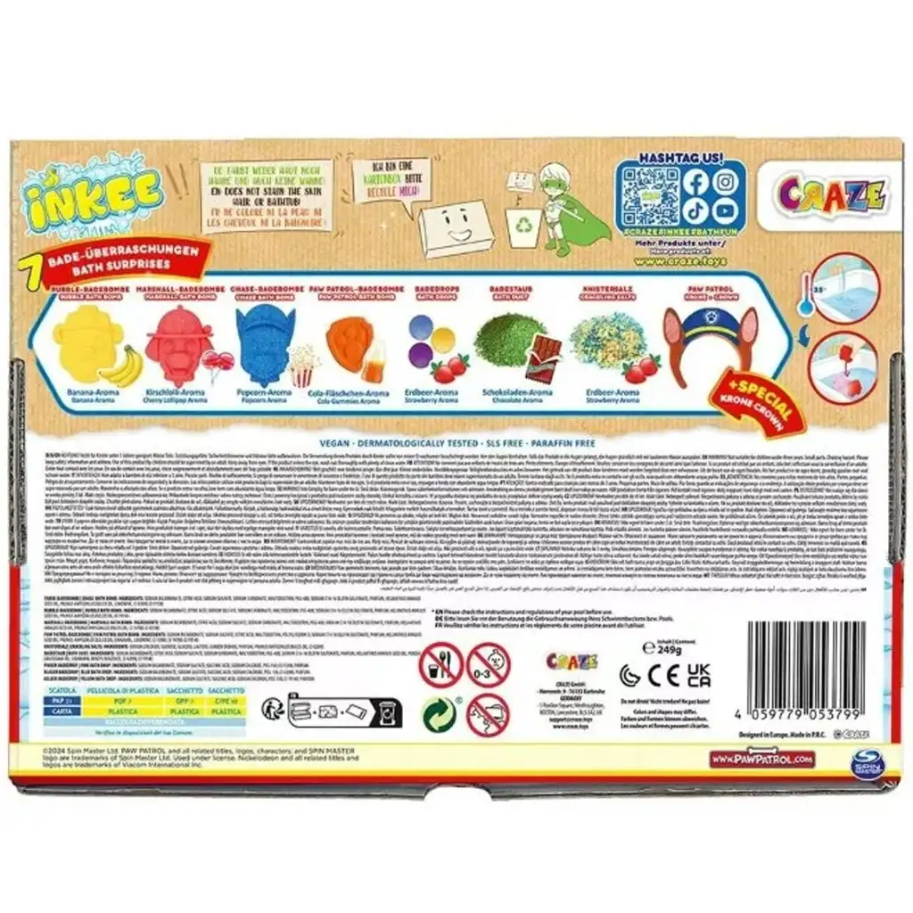 Naj se začne reševanje kopeli s Tačkami na patrulji! Velik kopalni set Craze Inkee Tačke na patrulji je vznemirljiv 7-delni paket presenečenja za kopanje, ki bo zagotovo popestril kopanje v kadi za vsakega malčka. Glavni junaki paketa so Chase, Marshall in Rubble, ki v obliki dišečih kopalnih bomb pomagajo otrokom narediti večerno kopel zabavno in dišečo.