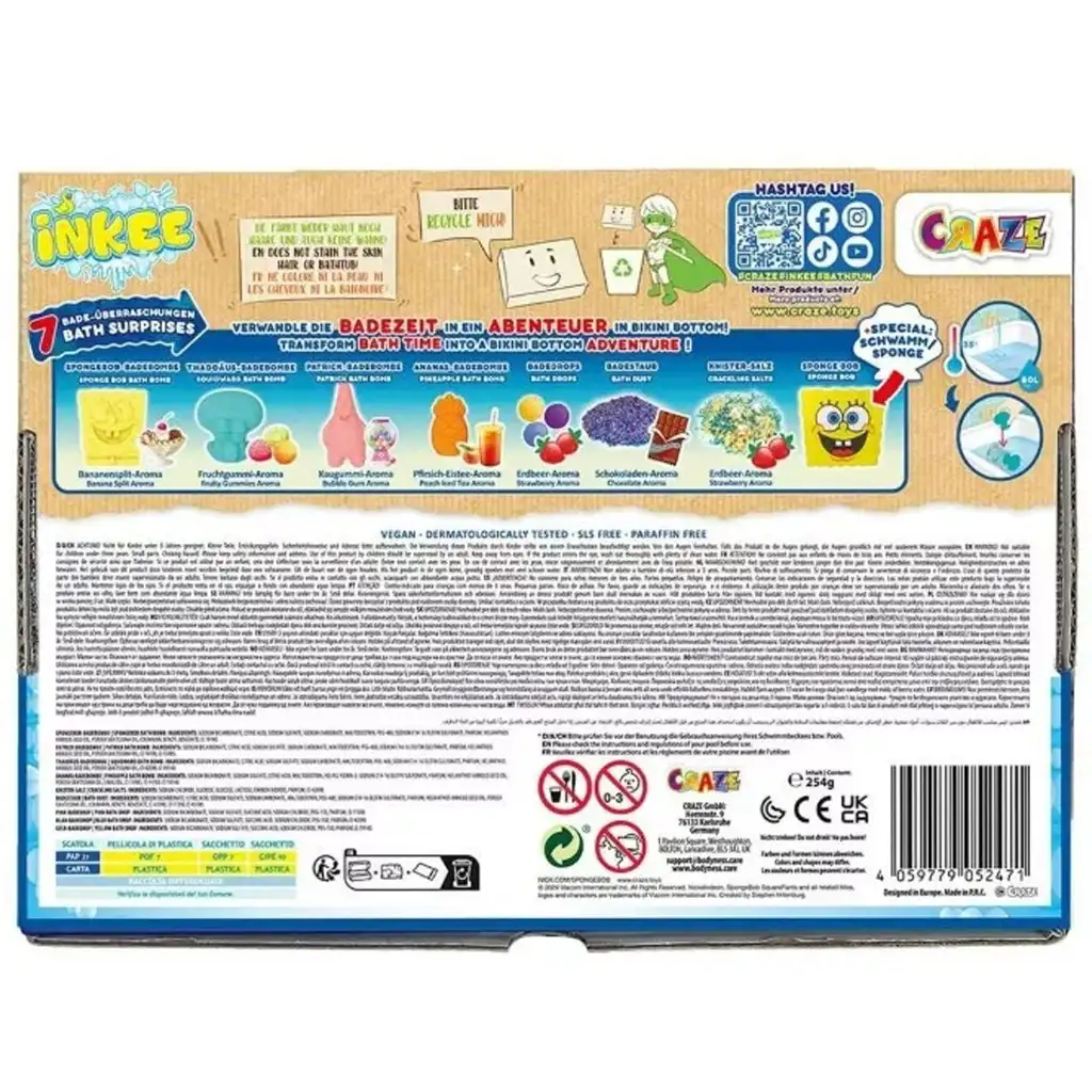 Set skriva 7 vznemirljivih kopalnih presenečenj, vključno s posebnimi oblikami kopalnih bomb v obliki Spuži Kvadratnika, Patrika, Lignja in Ananasove hiše, ter bleščečo kopalno soljo in kopalnim prahom. Vsak kos je prijazen do kože, veganski in narejen z negovalnim avokadovim oljem, zato je hkrati zabaven in negovalen za otroke. Kopalne bombe so na voljo v šestih različnih vonjih, kot so banana, sadje, žvečilni gumi ali čokolada – tako bo kopanje ne le barvito, ampak tudi dišeče doživetje.