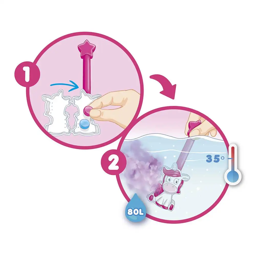 Otroci lahko sami upravljajo barvno čarovnijo s pomočjo držala v obliki enoroga, ki naredi šumenje in barvanje tablet še bolj zabavno. Kopalne tablete vsebujejo mandljevo olje, ki neguje in vlaži otroško kožo, medtem ko je njihova nežna in koži prijazna sestava popolnoma varna. Izdelek je 100% veganski, brez mikroplastike, glutena, parafina in SLS, zato je idealna izbira tudi za otroke z občutljivo kožo.