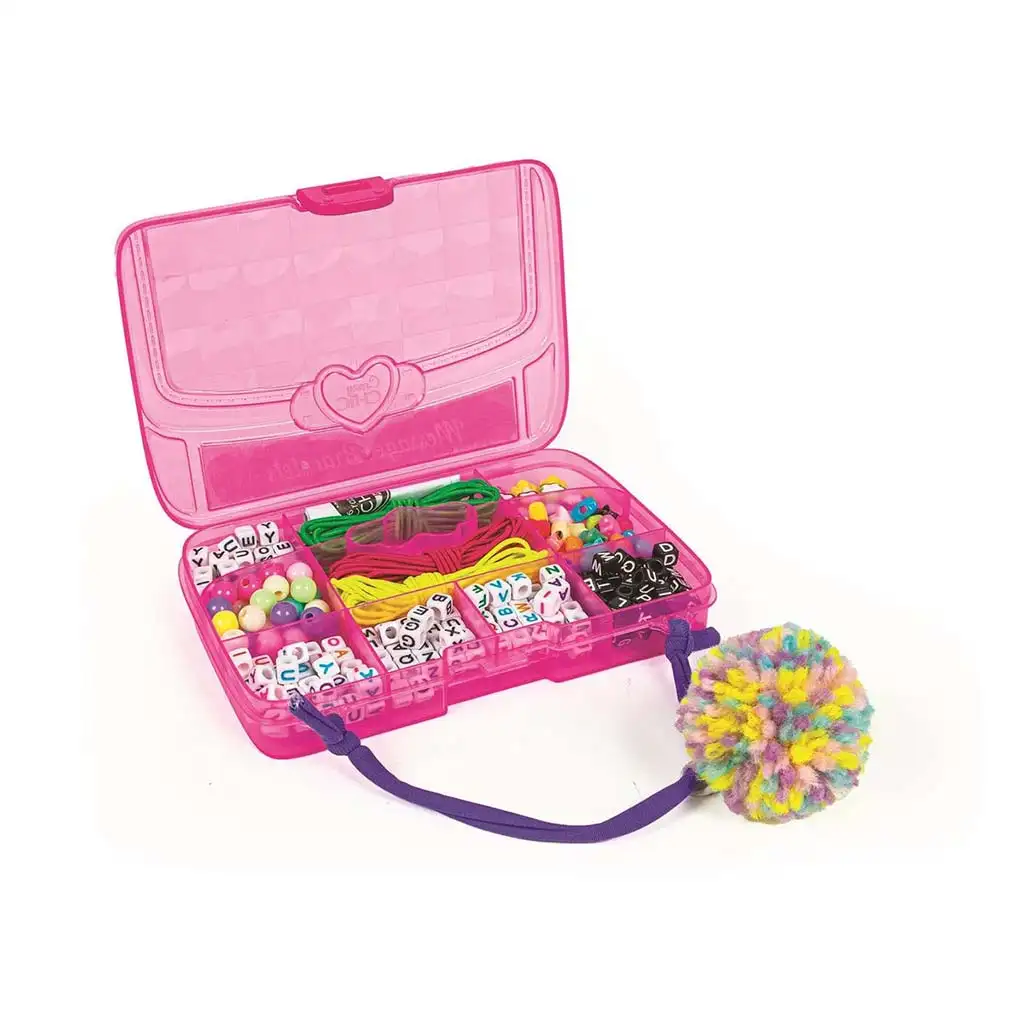Sprostite ustvarjalnost svojega otroka s tem ustvarjalnim kompletom za sporočila, ki je popolna izbira za vse male izdelovalce nakita in ustvarjalce. Komplet je zapakiran v praktični, prozorni škatli v živahni rožnati barvi, ki je razdeljena na predalčke, tako da ima vsaka perla in pripomoček svoj prostor. Set vsebuje raznobarvne in različno oblikovane črkovne perle, pisane perle, okraske v obliki srčkov ter barvne vrvice, s katerimi je možno izdelati najrazličnejše zapestnice, ogrlice in druge dodatke.