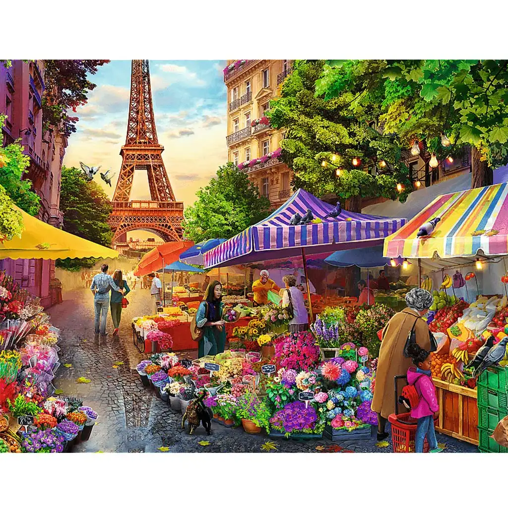 Ta 1000-delna sestavljanka je idealna izbira za vse, ki imajo radi izzivalne sestavljanke in podrobne, živahne slike. Kosi so izdelani iz premium kakovostnih materialov, kar zagotavlja natančno prileganje in trajnost. Končna velikost slike je 68 x 48 cm, kar je popolno za uokvirjanje in okrasitev stene vašega doma ter vas spominja na prijetno preživljanje časa in vzdušje pariške tržnice.