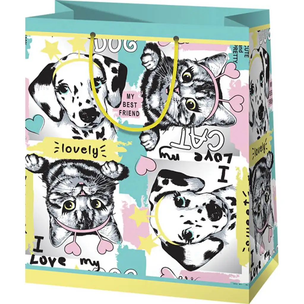 Pokažite ljubezen do hišnih ljubljenčkov z darilom s to srednje veliko darilno vrečko! Na površini vrečke so vidne igrive figure psov in mačk, ki jih naredijo idealne za katero koli priložnost, še posebej za ljubitelje živali. Vrečka velikosti 18x23x10 cm je ne samo estetsko privlačna, ampak tudi funkcionalna. Sijajni laminirani papir zagotavlja, da je vrečka trpežna in vzdržljiva. Ojačan dno zagotavlja, da vrečka ohrani svojo obliko, tudi če vanjo postavimo težja darila. Praktični in močni trakovi ne omogočajo le enostavnega prevoza, ampak tudi zagotavljajo eleganten videz vrečke.