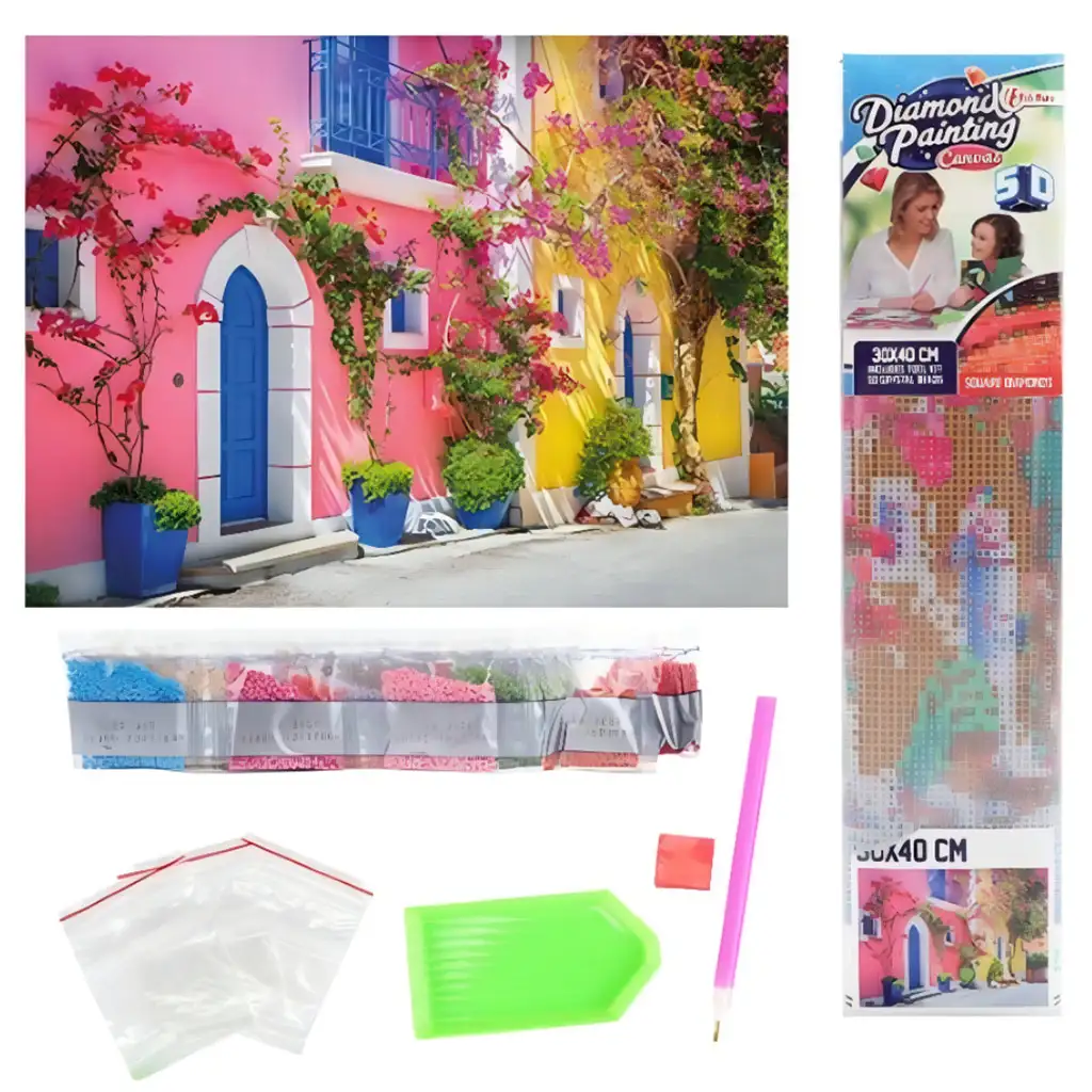 Set za diamantno slikanje "Barve Grčije" ponuja barvito in impresivno ustvarjalno priložnost, ki prinaša čar grških otokov v vaš dom. Ta 30x40 cm diamantna sestavljanka prikazuje idilično grško ulico, kjer oživijo hiše v živahnih barvah, modra vrata in okna ter čudovit pogled na bugenvilije, ki krasijo stene. Slika z živahnimi odtenki roza, rumene in modre prikliče sončno, mediteransko vzdušje Grčije, ki očara vsakogar.
