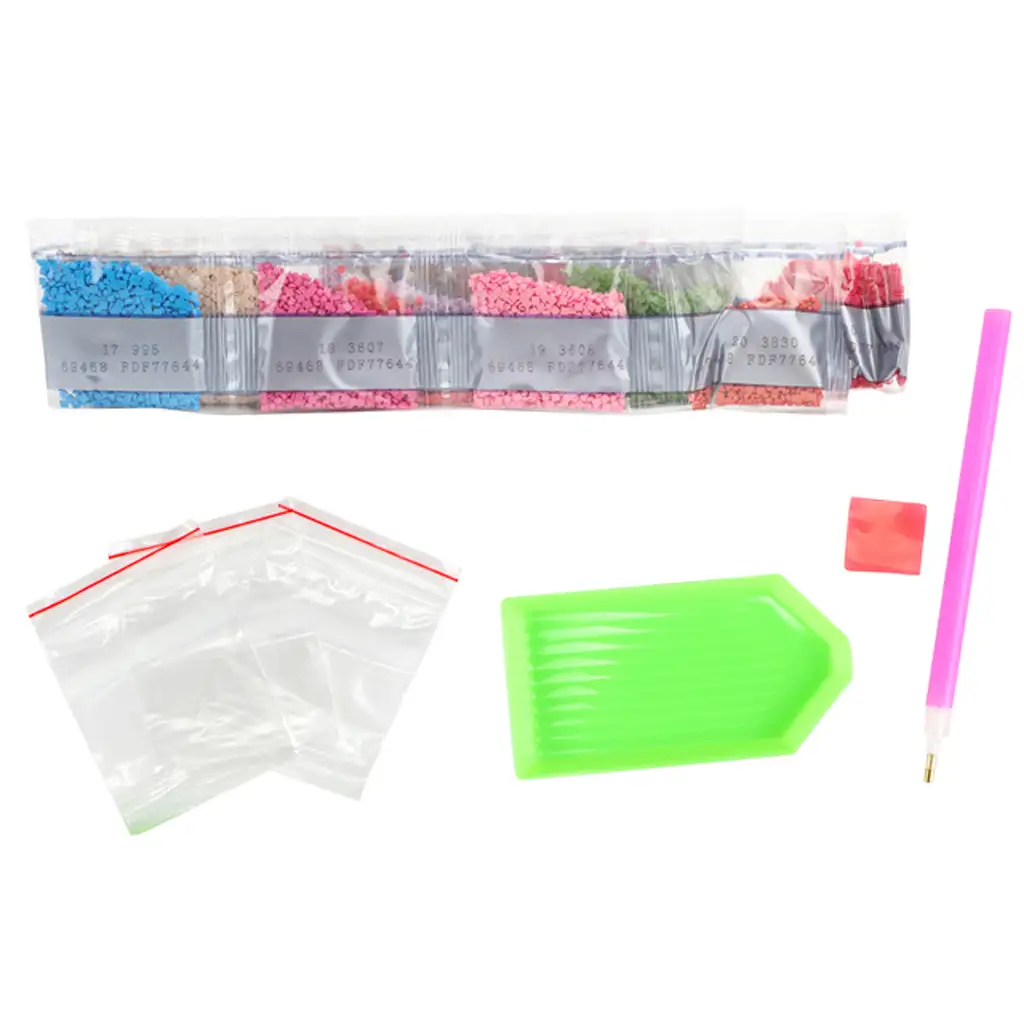 Diamantno slikanje ni samo zabavno, ampak tudi razvija: krepi koncentracijo, potrpežljivost in finomotoriko. Komplet vsebuje vse, kar potrebujete za delo: predtiskano, samolepilno platno, barvne diamantne kamenčke, svinčnik za diamantke, vosek, zelen pladenj in majhne shranjevalne vrečke. Platno z označbami pomaga, da lahko preprosto namestite barvite diamantke na prava mesta – tako tudi mlajši otroci izkusijo uspeh.