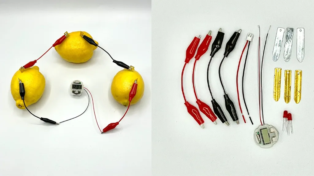 Komplet za eksperimentiranje z elektriko iz limon Lemon Electricity STEM vsebuje štiri krokodilčke, tri kose bakra, tri kose cinka, povezovalno žico za žarnico, dve žarnici in uro. Mladi znanstveniki lahko s pomočjo kompleta odkrijejo, kako proizvesti elektriko iz limon.