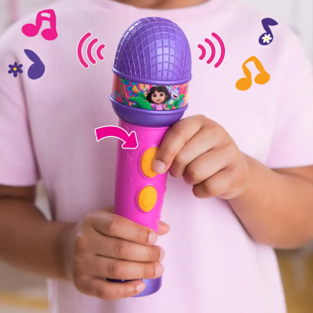 Dora, raziskovalka mikrofon s pesmimi – vesela, barvita pevska igrača za majhne raziskovalce, s katero se lahko otroci počutijo kot prave zvezde. Vijolično-rožnat, v roki udoben mikrofon je okrašen z motivom Dore in z enim samim pritiskom na gumb napolni sobo z glasbo, melodijami in zabavnimi zvoki. Malčki lahko pojejo skupaj z Doro, posnemajo najljubše prizore ali pa preprosto pripravijo svoj mini koncert za družino.